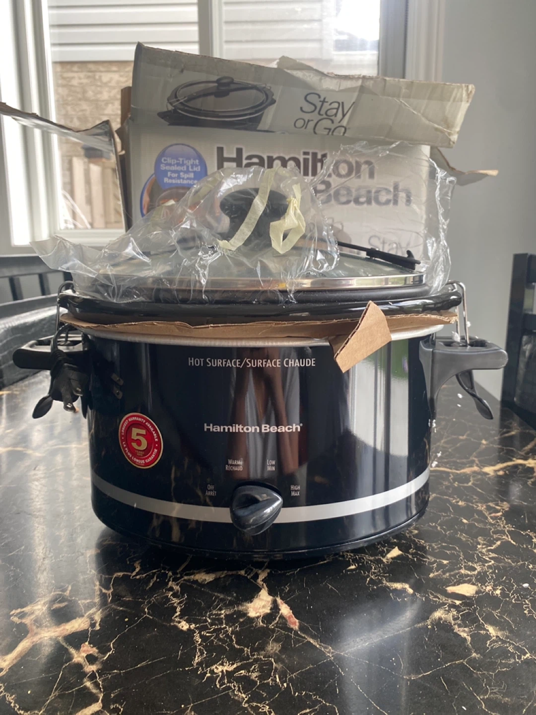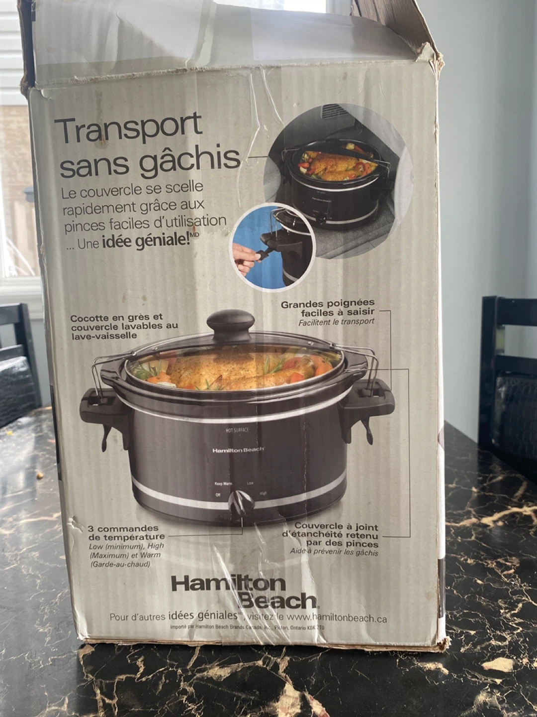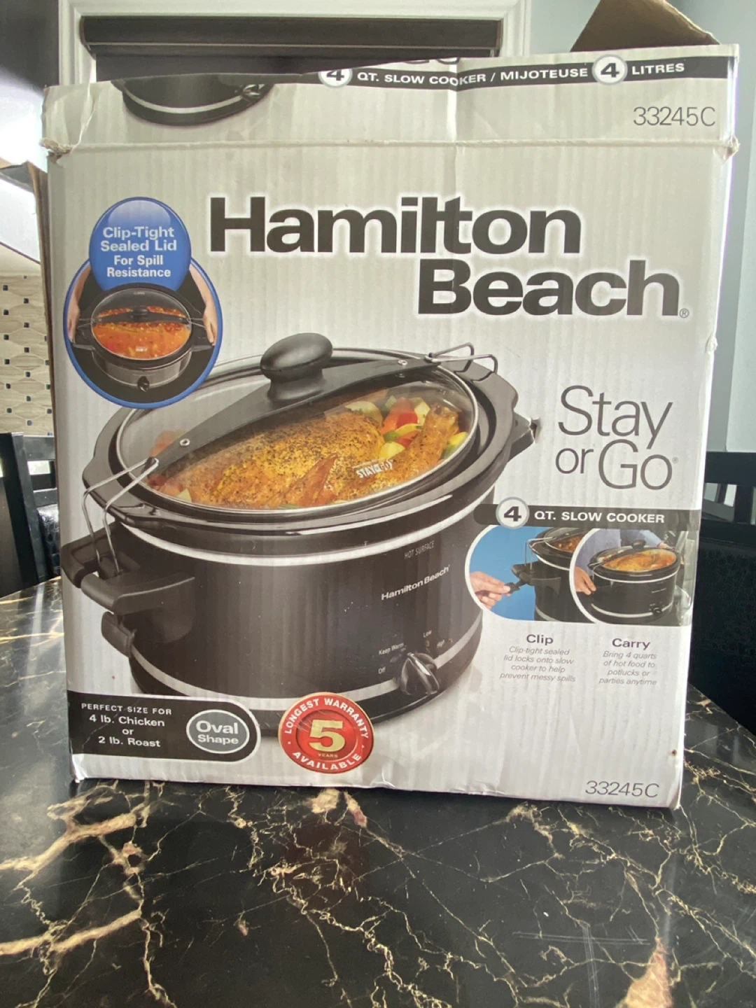 Selling a brand new Hamilton Beach Stay or Go 4-quart slow cooker! It's still in its original box and packaging. This slow cooker is perfect for 4 lb chicken or 2 lb roast. It features a clip-tight sealed lid for spill resistance, making it easy to transport without any mess. The box includes the slow cooker and all original components. A great addition to any kitchen!