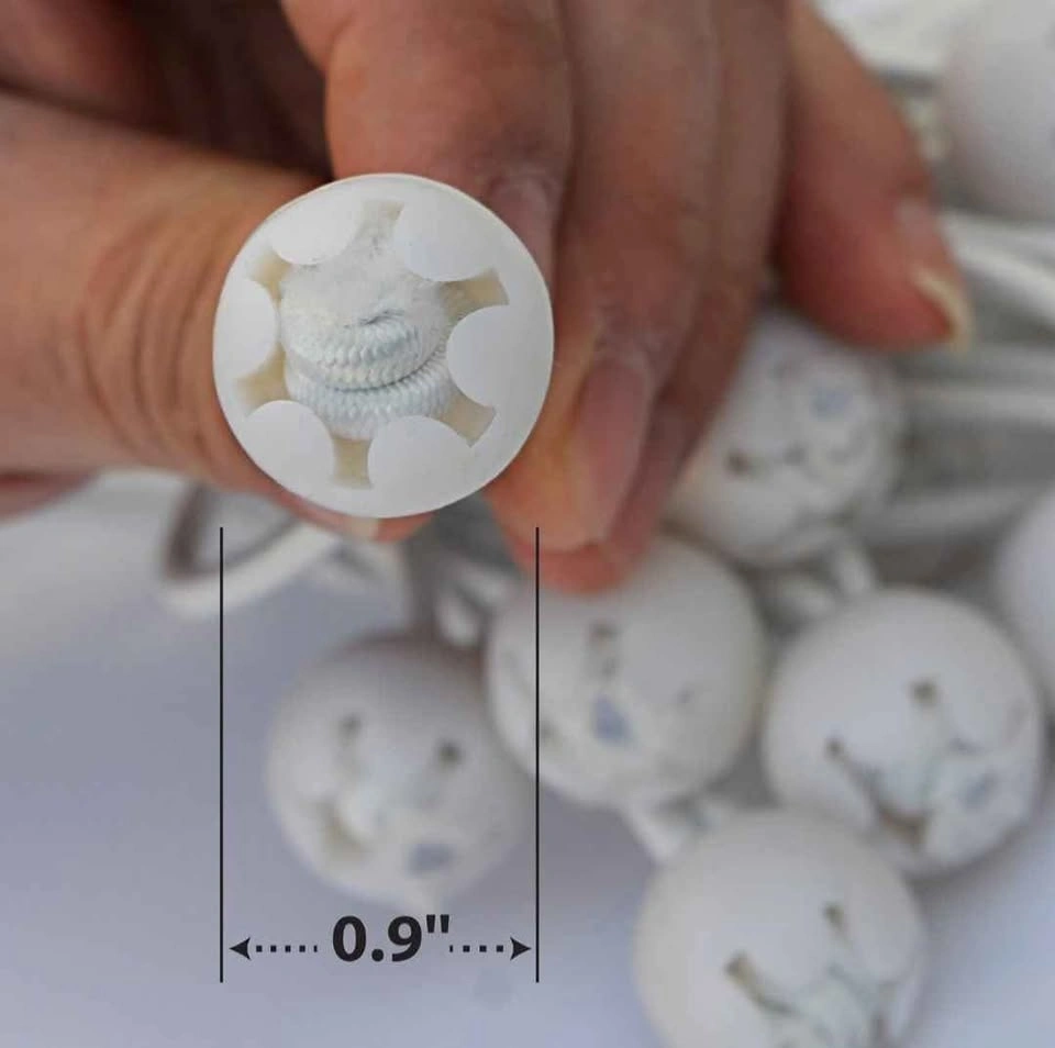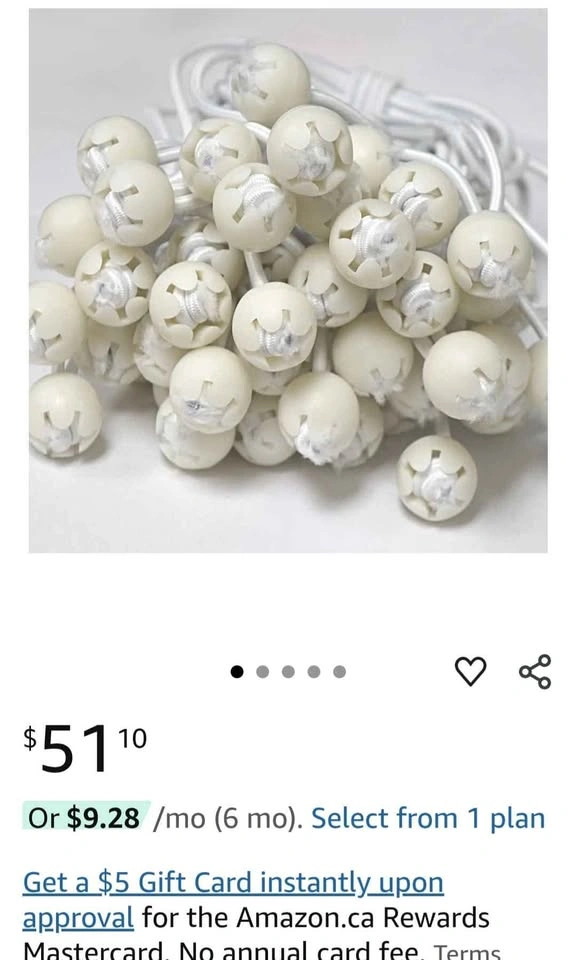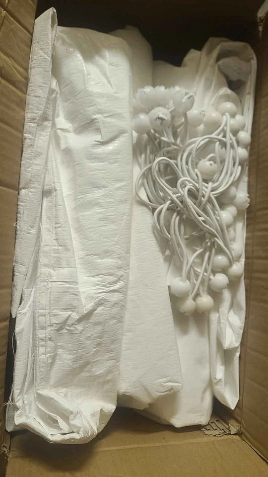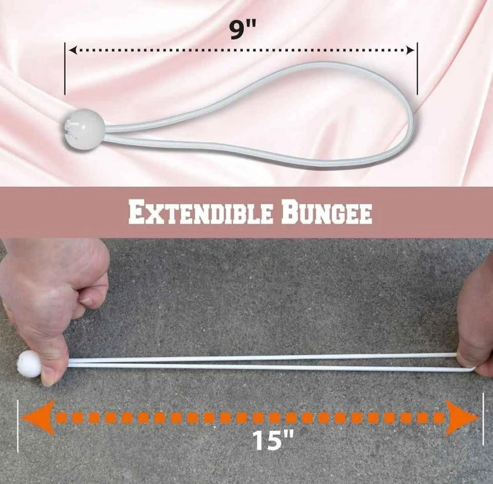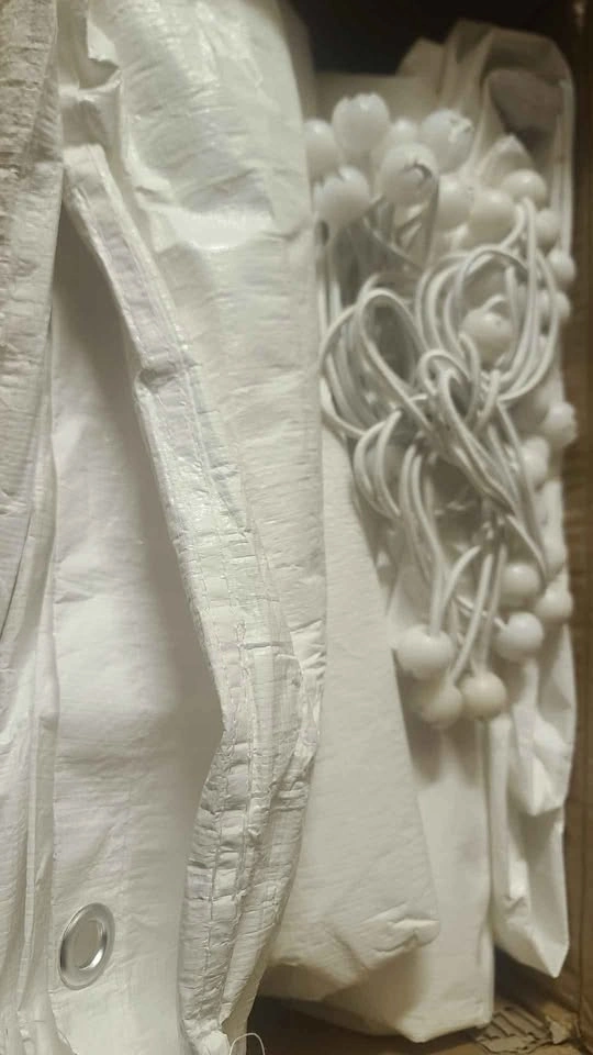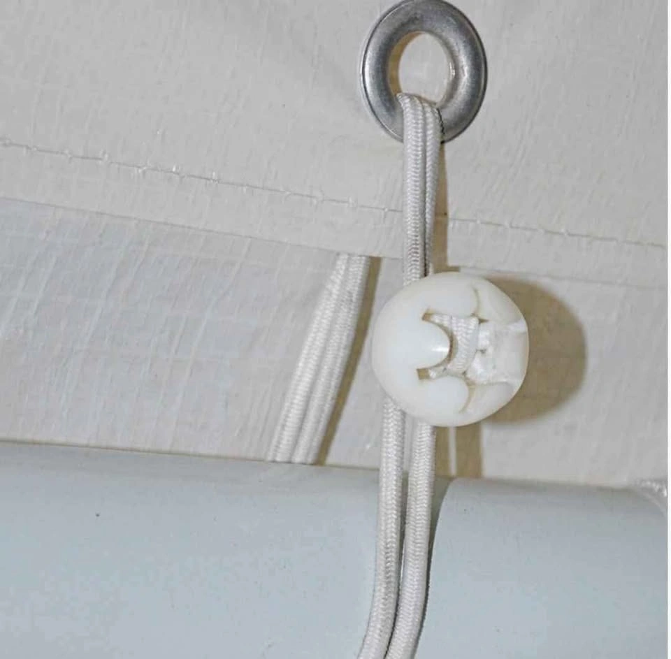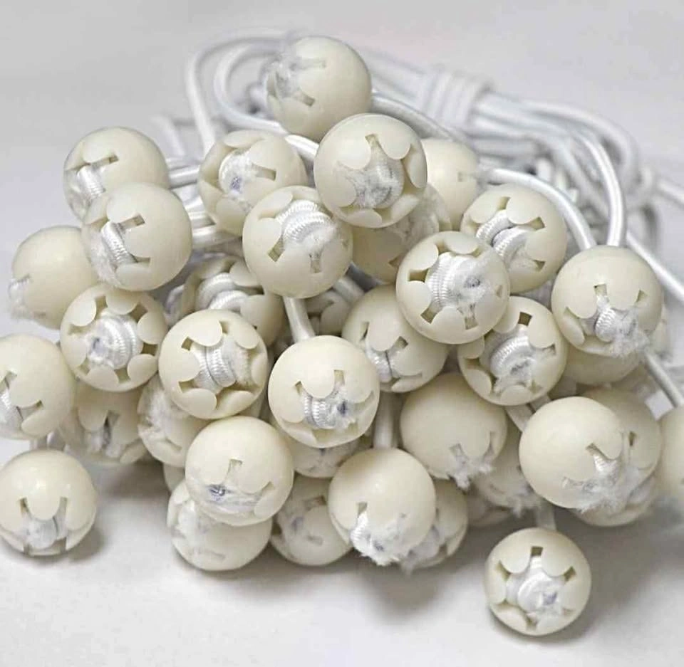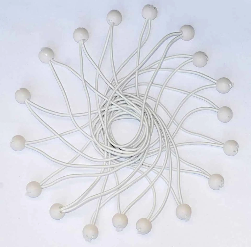 50 pack of white, 9-inch ball bungees. Elasticized cord with poly carbonate ball at one end. Premium quality cord with extra stretch, makes them easier to attach and remove. Quick and easy to use, simply feed the elasticized loop through the tarp grommet so the ball fits snugly against the grommet. Then use the loop to secure the tarp to a fixed point. Let me know if you're interested!