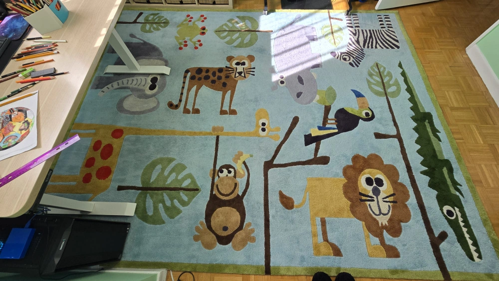 This is a cute rug with a jungle animal theme. It would be perfect for a kid's room or playroom! It features a lion, monkey, elephant, and other fun animals on a light blue background
