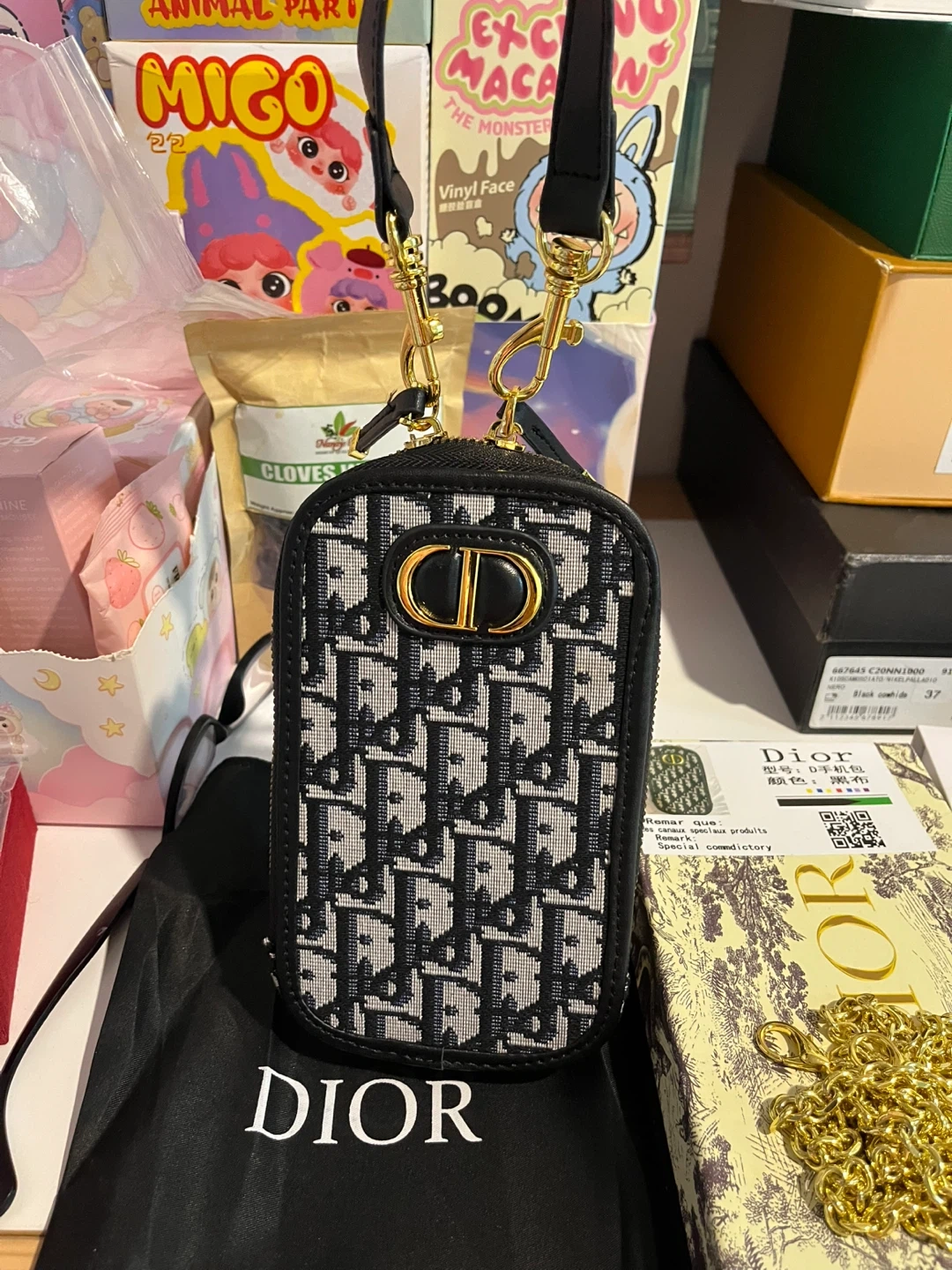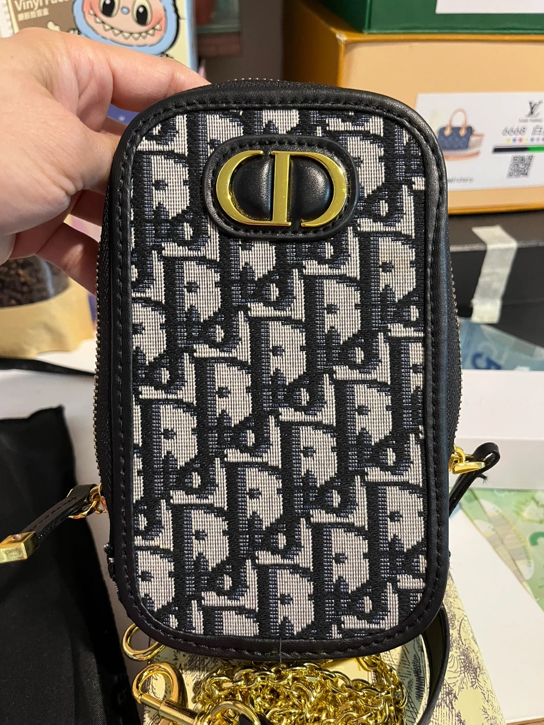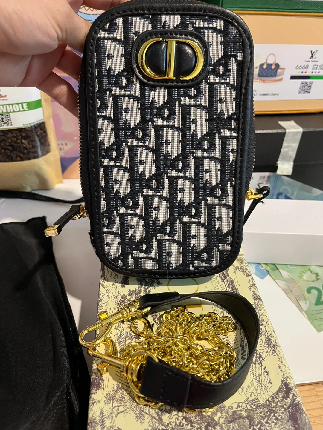 This inspired Dior phone pouch is perfect for keeping your phone safe and stylish! It features the iconic Dior Oblique pattern and comes with both a leather strap and a gold chain strap. The pouch comes with its original box and dust bag. High quality materials