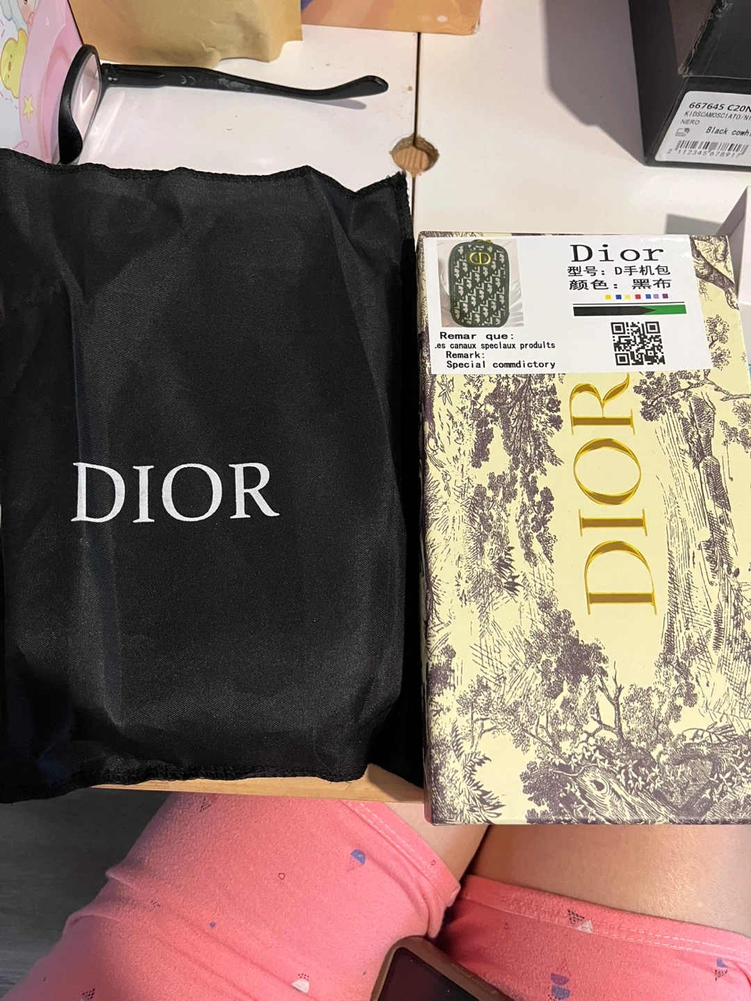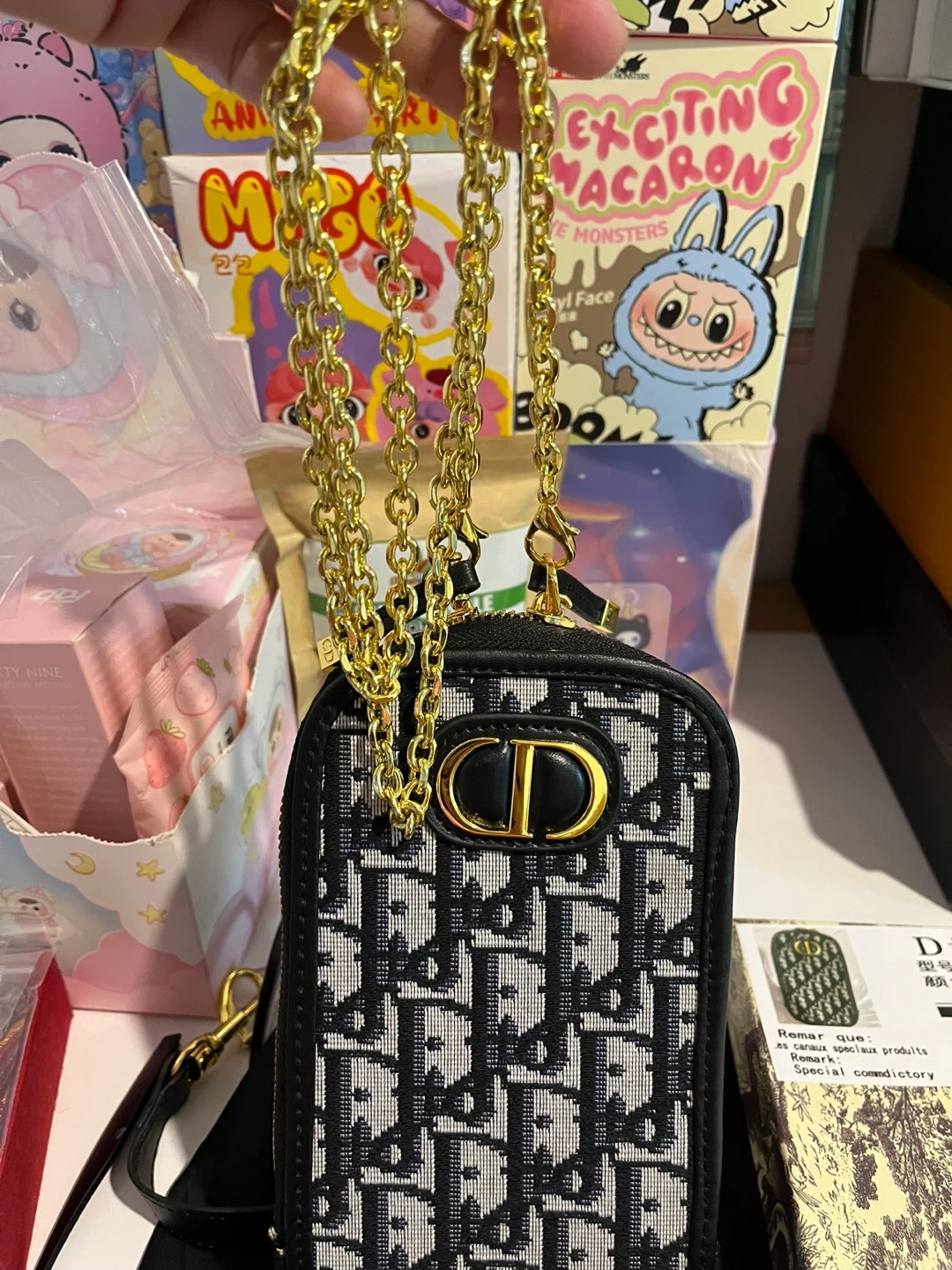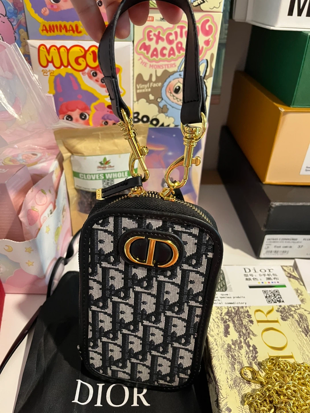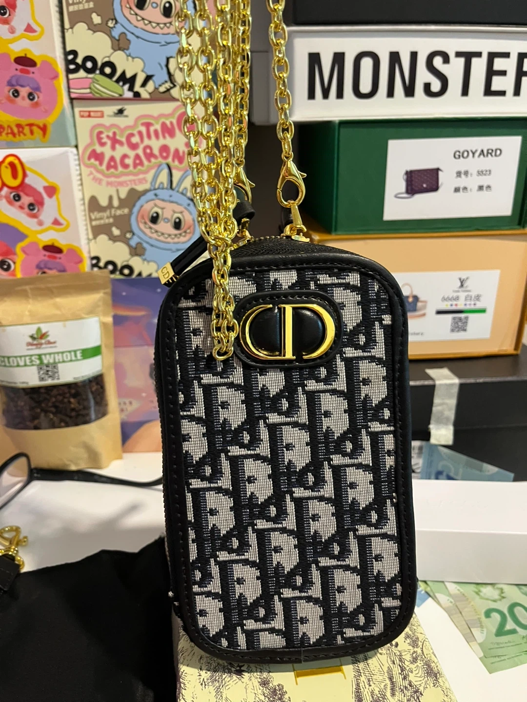 This inspired Dior phone pouch is perfect for keeping your phone safe and stylish! It features the iconic Dior Oblique pattern and comes with both a leather strap and a gold chain strap. The pouch comes with its original box and dust bag. High quality materials