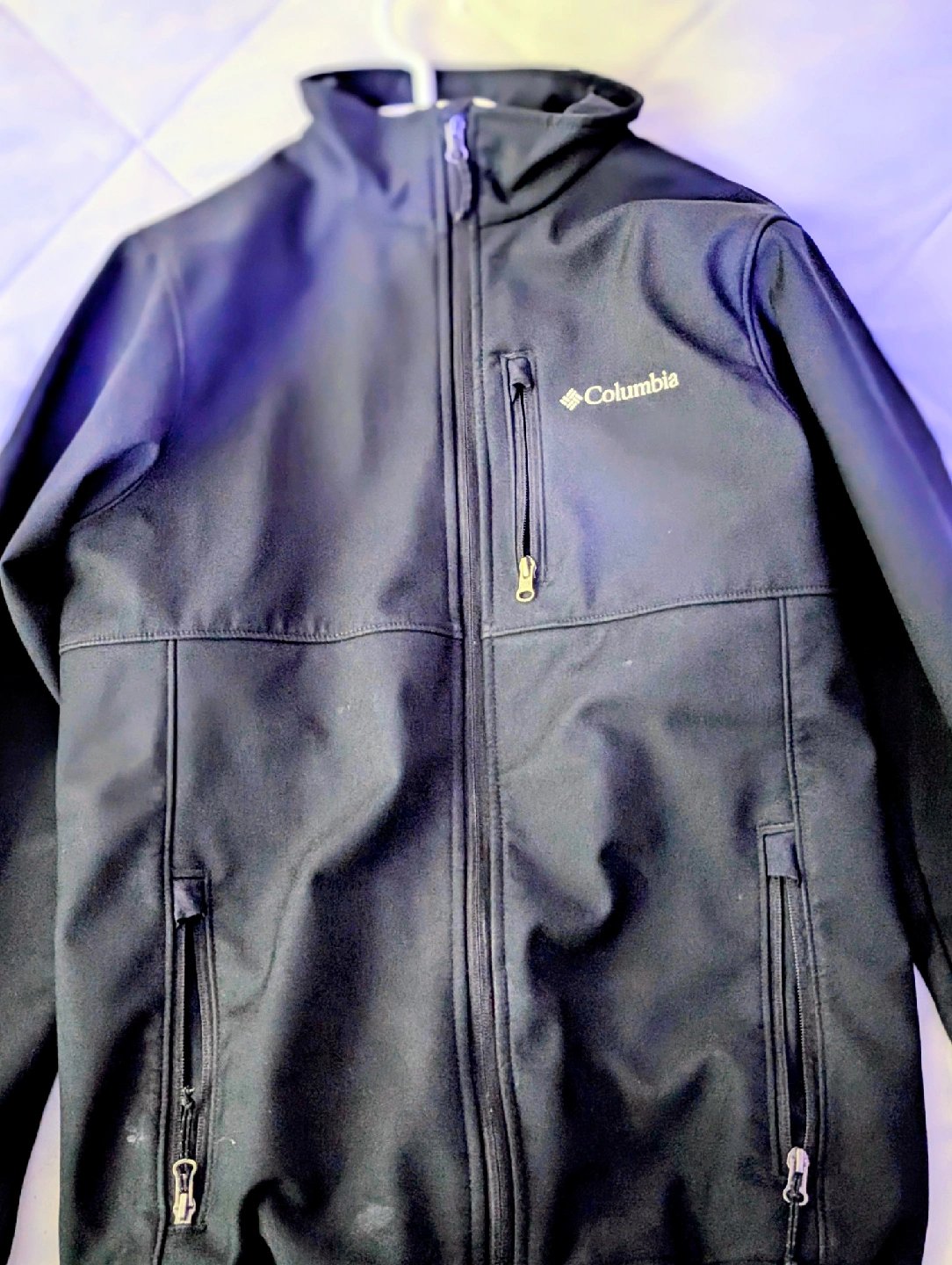 Selling a Columbia black softshell jacket in size small. It's in great condition and ready for a new home! Perfect for layering or wearing on its own during milder weather. The jacket features the Columbia logo and several zippered pockets. Unisex.
