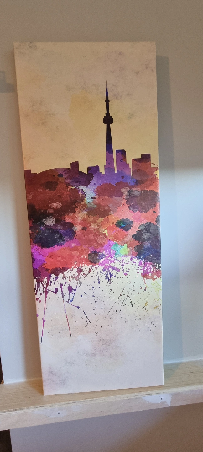 Canvas wall art featuring the Toronto skyline with the CN Tower. Has a watercolour style with a mix of colours.