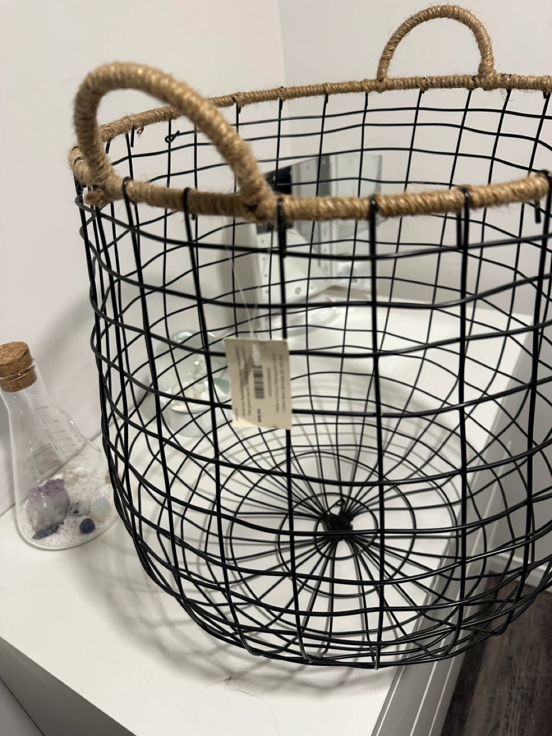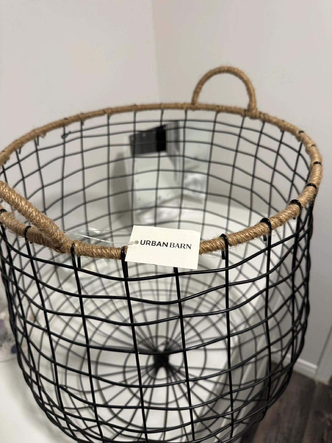 Selling a lovely black wire basket from Urban Barn! It features jute handles for a rustic touch. Perfect for adding some stylish storage to any room in your home