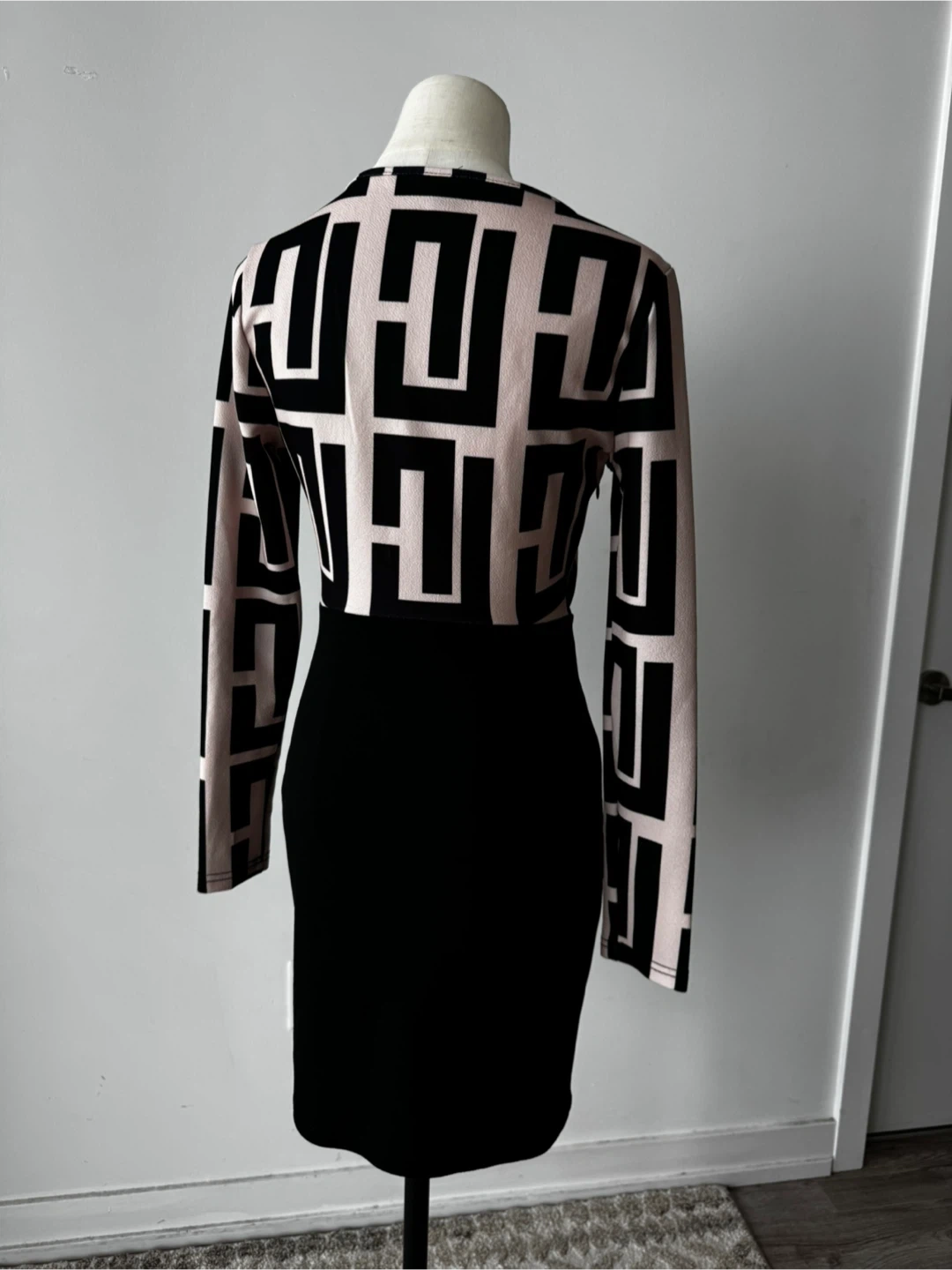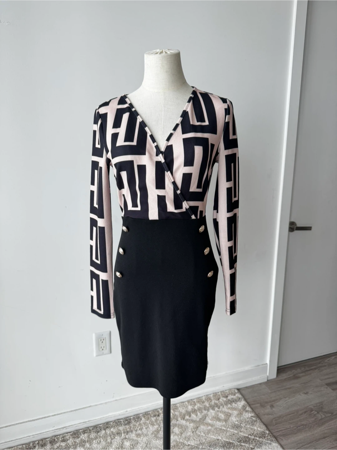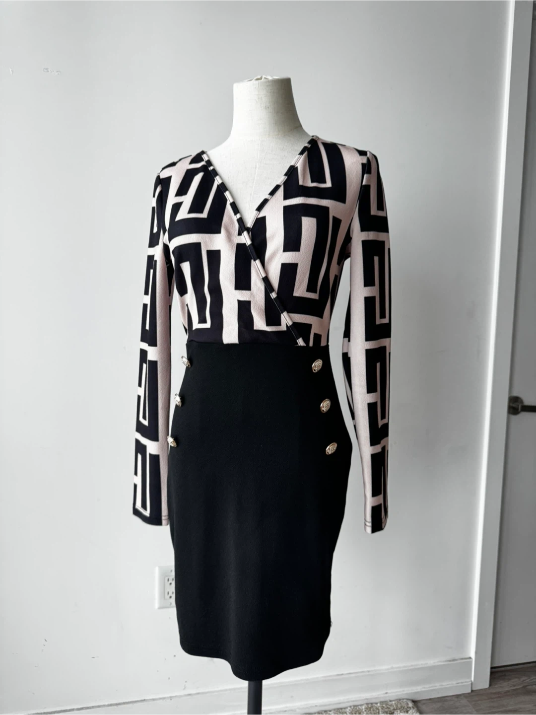 Stylish dress with a geometric print on the long sleeves and a solid black skirt. Features a flattering V-neck and button details on the skirt. Perfect for a night out or a special occasion!