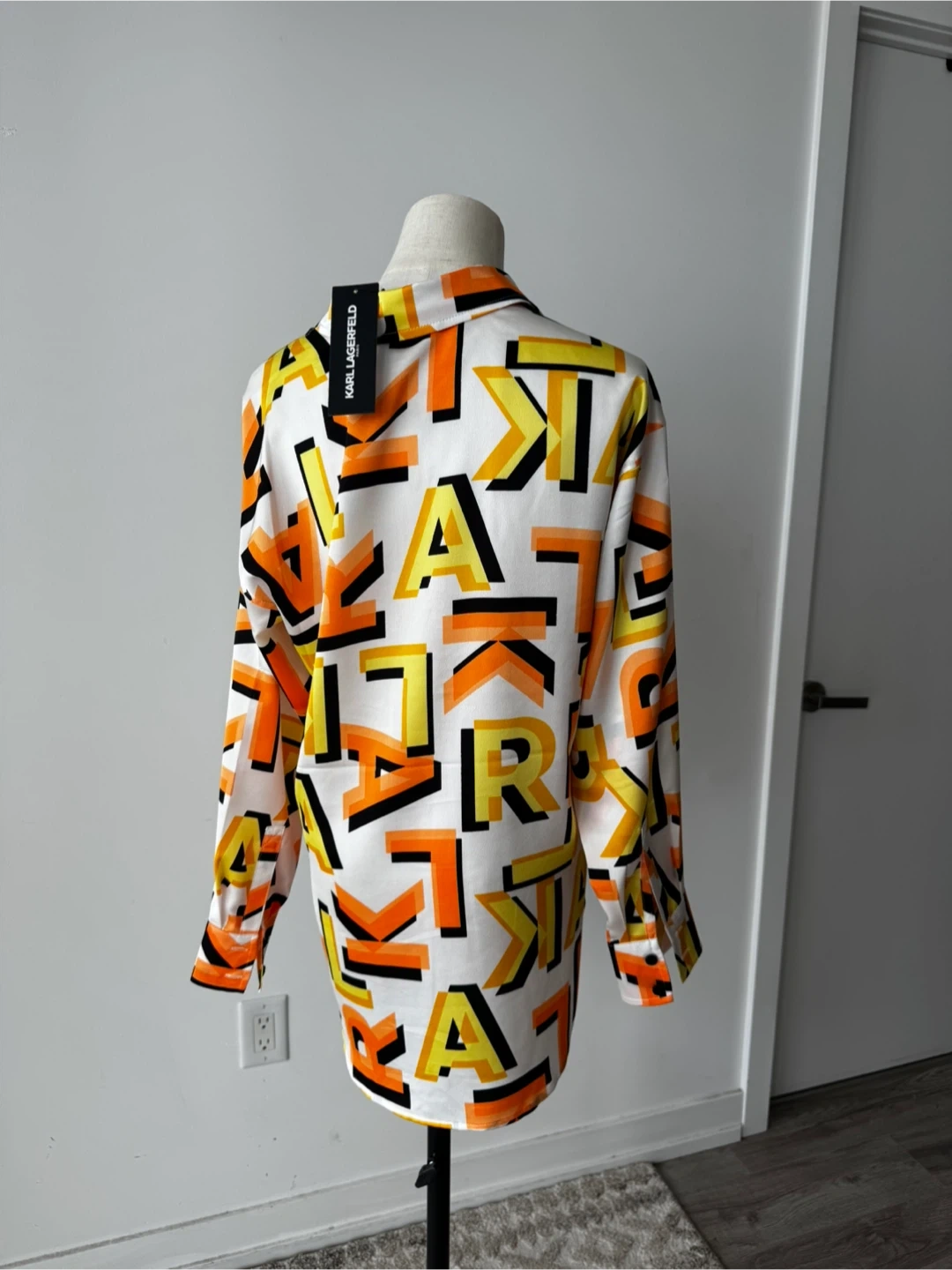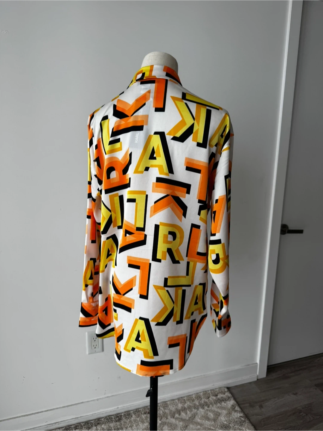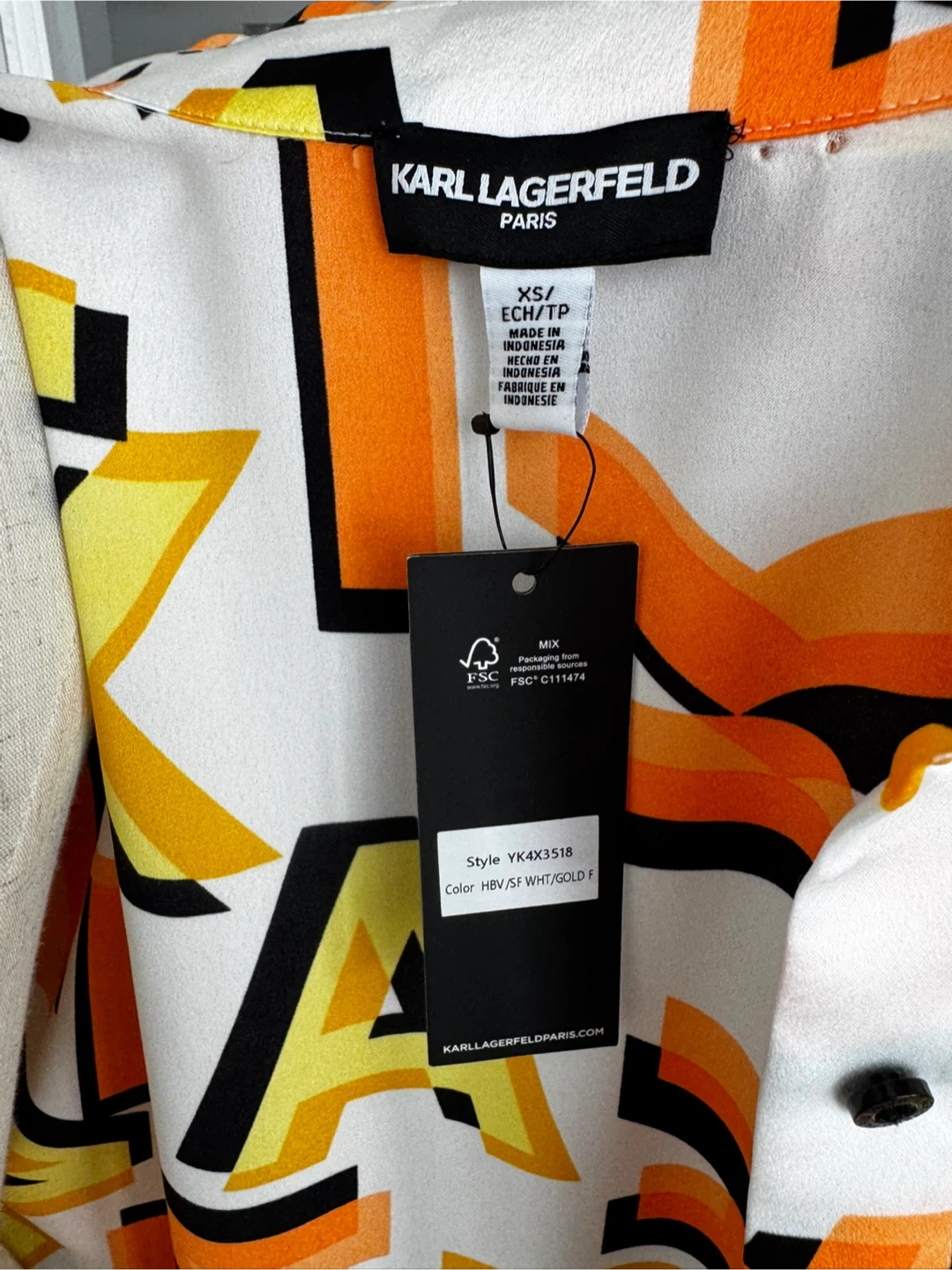 Here's a stylish Karl Lagerfeld blouse in size XS! The blouse features a unique white and gold print. The style number is YK4X3518. It's in great condition and ready for a new home