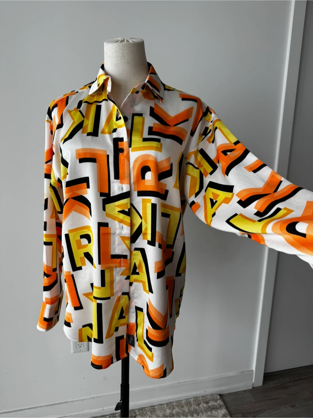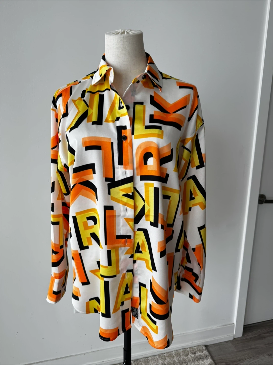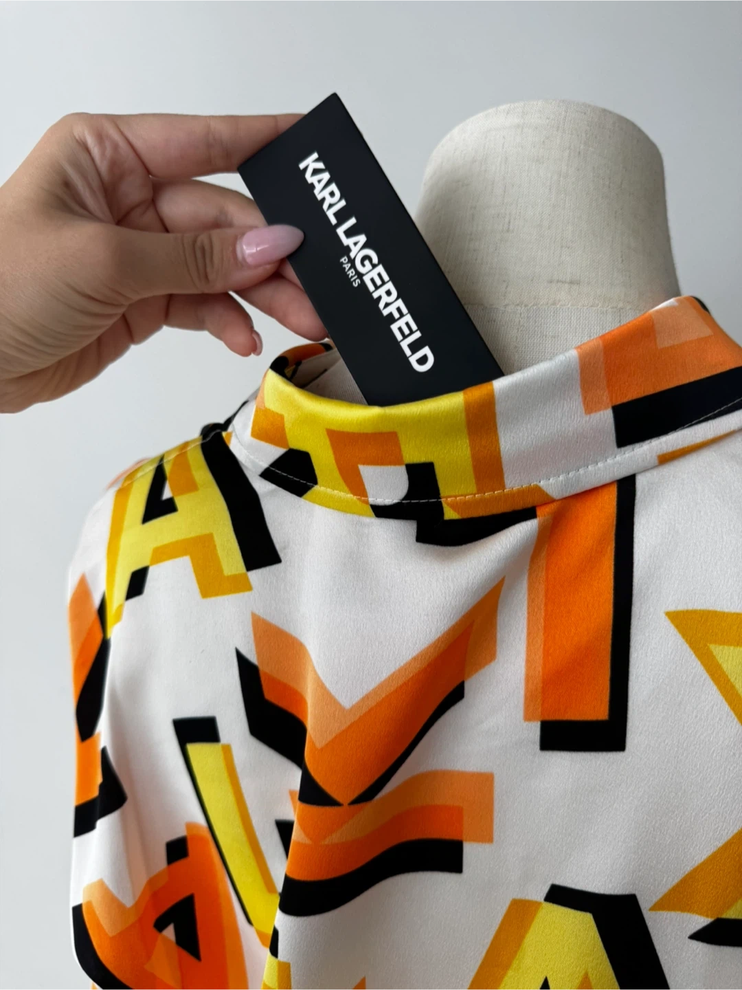 Here's a stylish Karl Lagerfeld blouse in size XS! The blouse features a unique white and gold print. The style number is YK4X3518. It's in great condition and ready for a new home