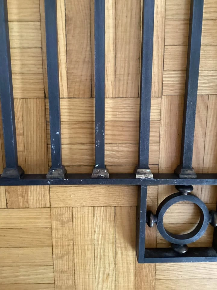 Rare antique cast metal cashier window grille, originally used in a bank, post office or other setting in the early 1900s (Estimated 1915 to 1925 based on the more streamlined art deco style). Features the original “CASHIER” header plate, vertical iron bars, and aged patina that reflects its long history. Perfect for collectors of architectural salvage, antique dealers, or as a statement art or decor piece in a home, office, bar, cafe, or retail space. Can be displayed as wall art, mounted in a frame, or repurposed in interior design. Made from cast iron/steel construction and cast brass/bronze lettering all with original patina (has been lightly cleaned but not refinished) preserving historic character. Structurally sound and extremely solid and heavy. Shows expected wear and age-appropriate marks. Light paint spots present but could be easily cleaned by the new owner if that is the look they wish. Measures 18.5” wide and 28” tall. $550 CASH ONLY. Pick up ONLY near Parliament and Bloor