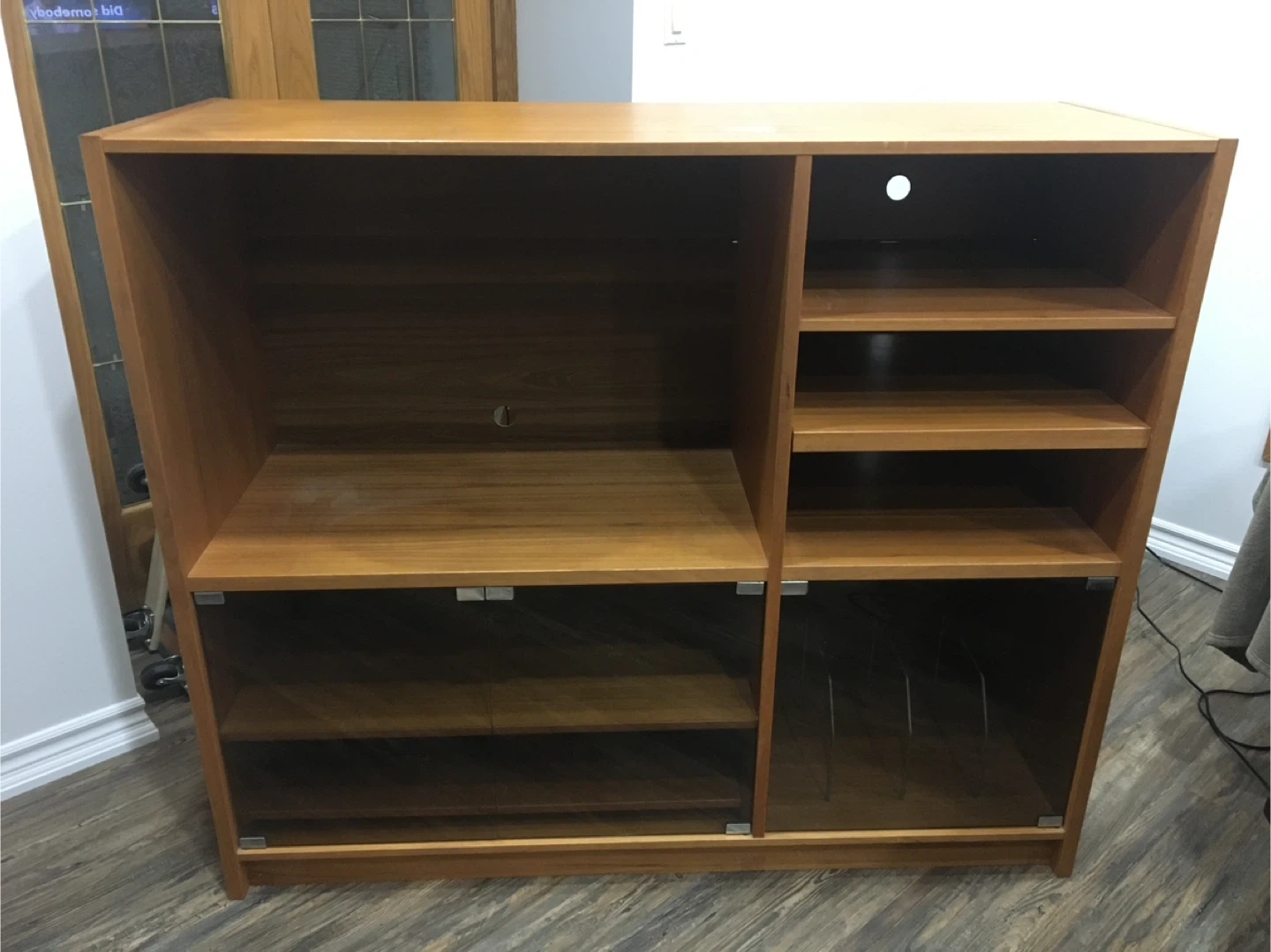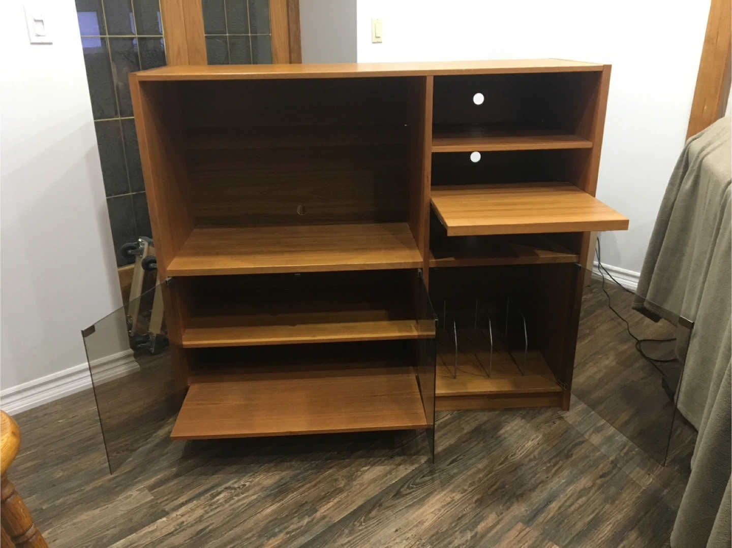 Teak TV/Audio/Video Cabinet . Has two pullout shelves of which one can be used for a record player. Storage space for your favourite LP’s. Can be fitted for optional roller kit for hard wood floors.
