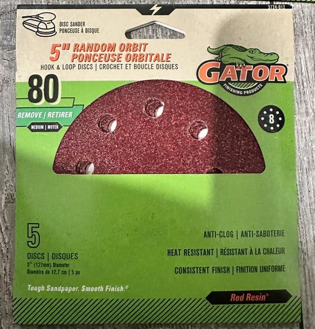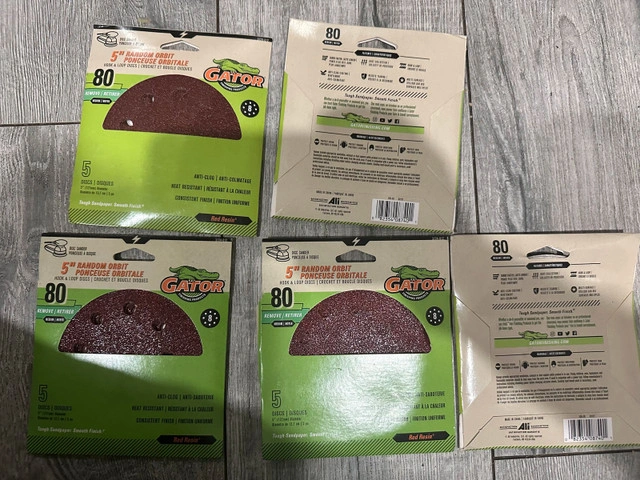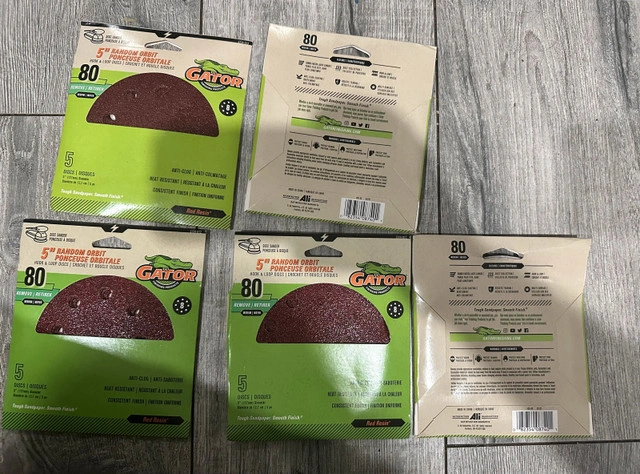 5 available, $10 each or $40 for all 5. I'm offering a brand new pack of five Gator 5" 80 grit sanding discs with hook and loop fasteners. * Disc Diameter: 5 inches * Grit: 80 (Medium) * Attachment Type: Hook & Loop * Quantity: 5 discs Let me know if you're interested!