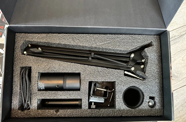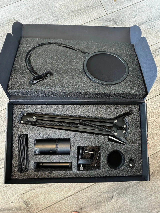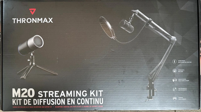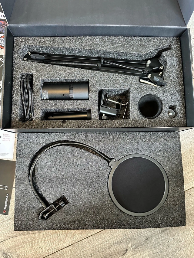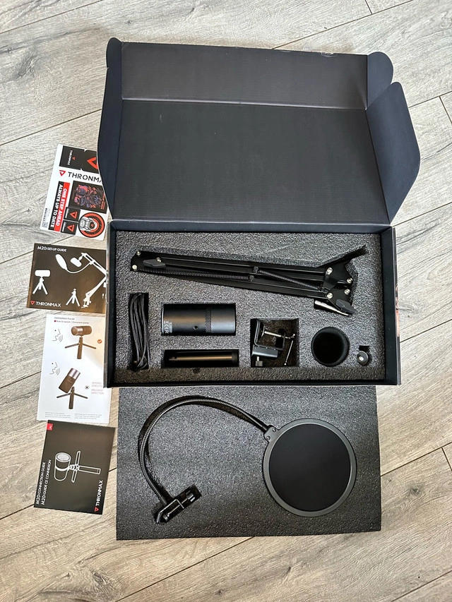 Brand new Thronmax Pro Audio Streaming Kit (TMM20KIT). Fully featured streaming kit includes everything needed for a professional audio setup. Items included: Microphone, Boom Arm stand with desk clamp, Pop Filter, Windscreen, Table Top Stand. Multiple uses: for Vlogging, YouTube, Gaming, Zoom, Twitch, and more. It has been designed with a professional sound chipset, which lets the USB microphone offer a high-resolution sampling rate. The microphone has a Type-C USB 2.0 data port, which is easy to connect with your computer. USB cable included. With the 16mm capsule, the USB microphone provides a strong bass response. The condenser mic records your voice without plosives. RGB led light built-in to the back of the mic. If the ad's up, it's up for grabs!