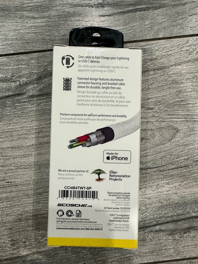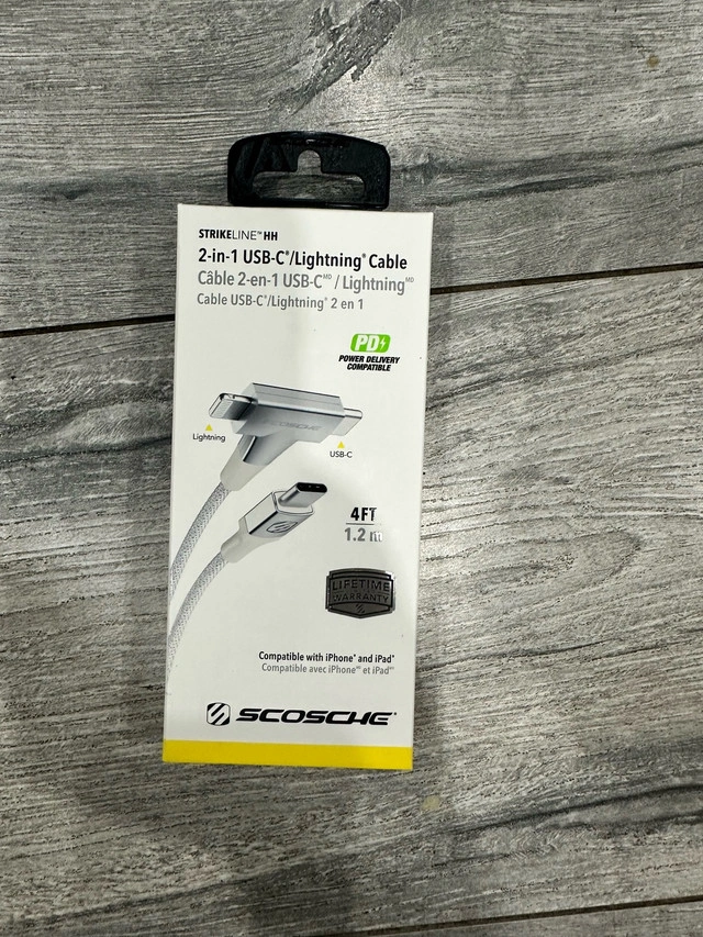 This Scosche 2-in-1 cable is brand new and ready to power up your devices! With its unique design, it features both USB-C and Lightning connectors, making it compatible with a wide range of devices, from the latest smartphones to tablets. The braided cable ensures durability and tangle-free use. Works all newer model phone which has Type C connectors or iPhone lightning connector Here are some more details: * Connectors: USB-C and Lightning * Type C to Type C * Cable Type: Braided * Length: Standard length for convenient use * Compatibility: Android and Apple devices Don't miss out on this handy cable that simplifies your charging needs! If the ad is up, it's available – no need to ask! Happy charging!