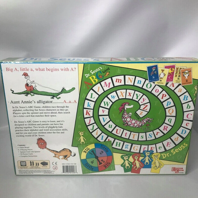 Players move along a track of 52 spaces (A a B b C c . . . Z z), and if the first to land on a square they take and keep a matching card with an image and word or phrase from the book upon which the game is based. Movement is determined by a spinner; each result can be taken either as a number (1-4), or "BIG" or "little" which advances one to the next upper- or lowercase lettered space. Game ends when the last player reaches the end, and the winner is the player who holds the most cards. Recommended for ages 3+. VIEW MY OTHER ADS!!!
