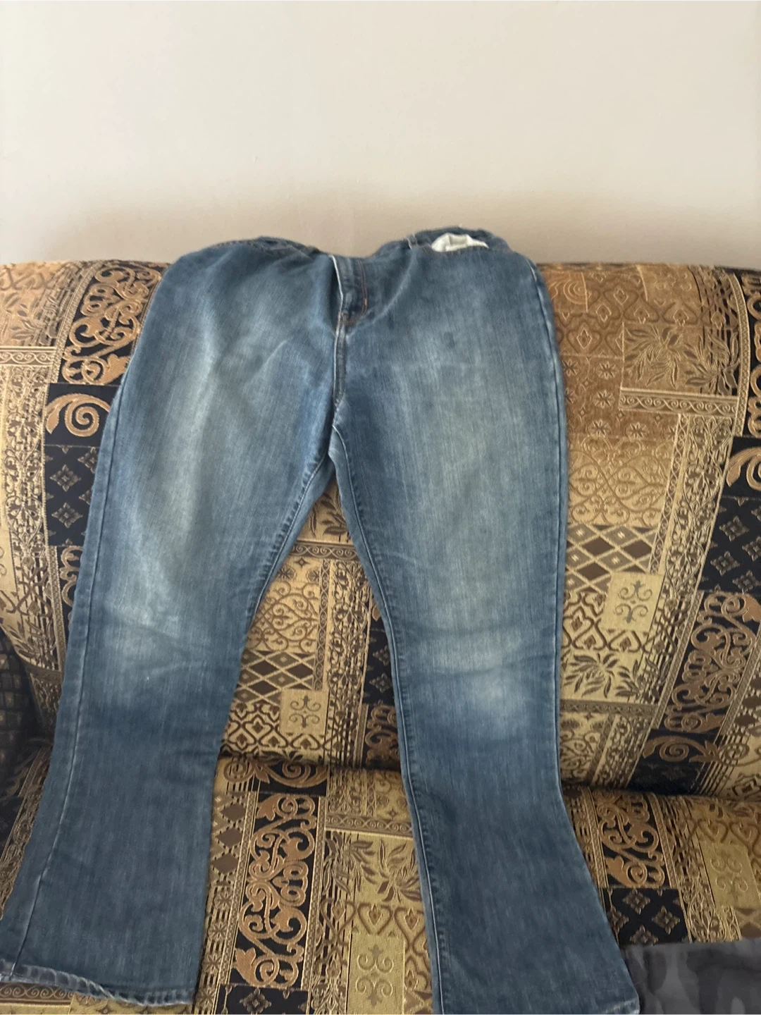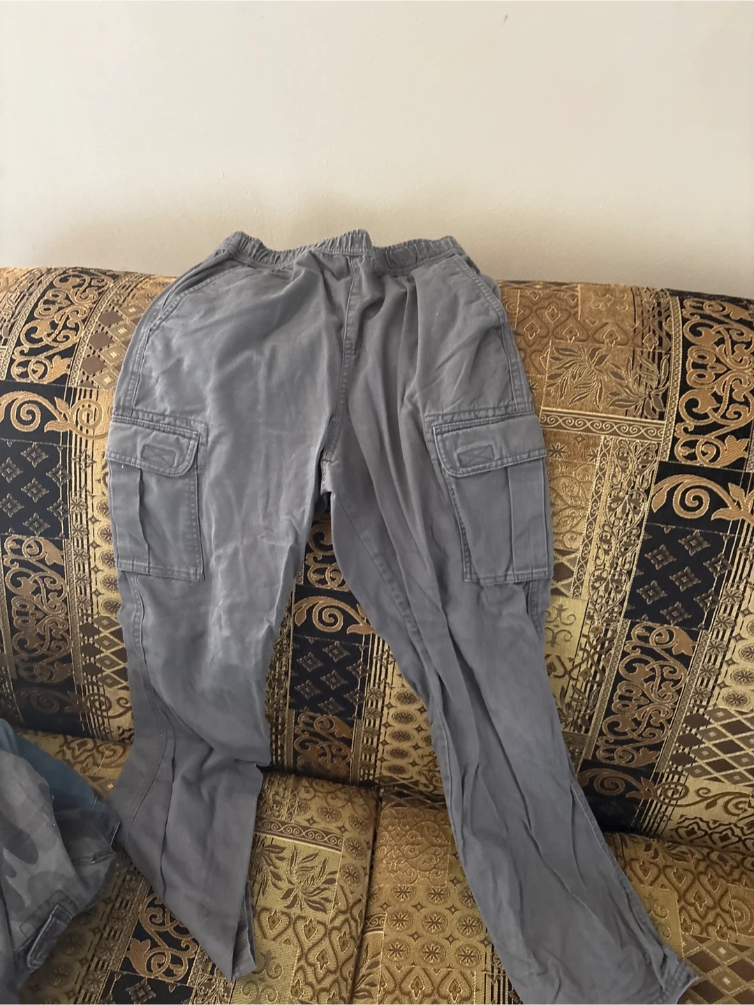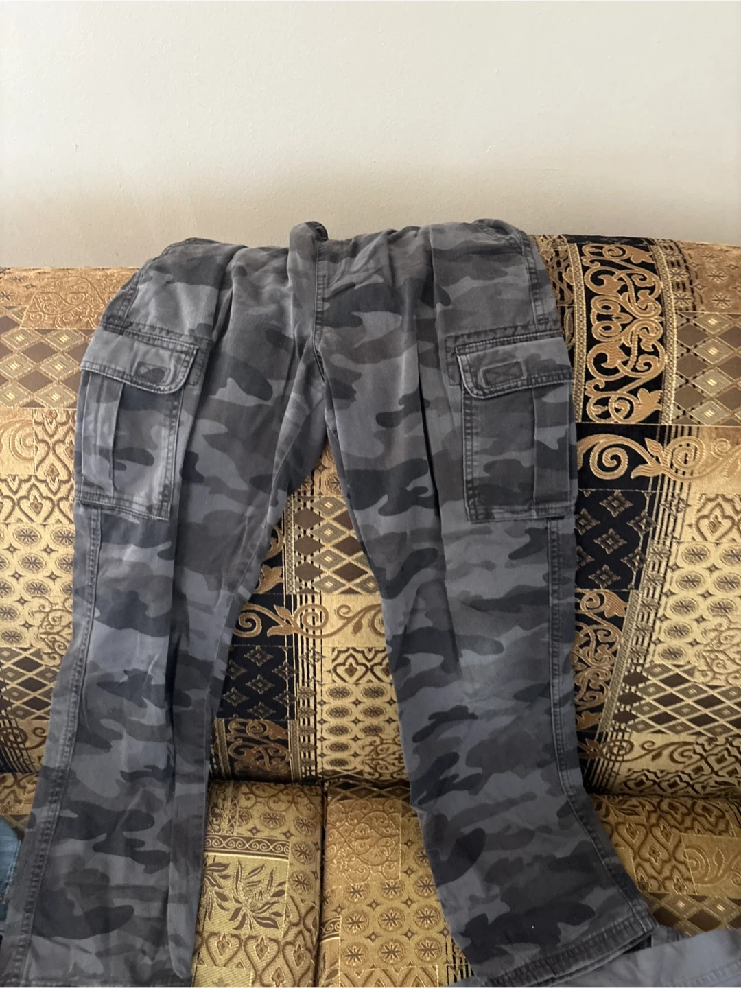 Selling a mixed lot of pants! Includes a pair of blue jeans, grey cargo pants, and camouflage cargo pants. All in good condition and ready for a new home