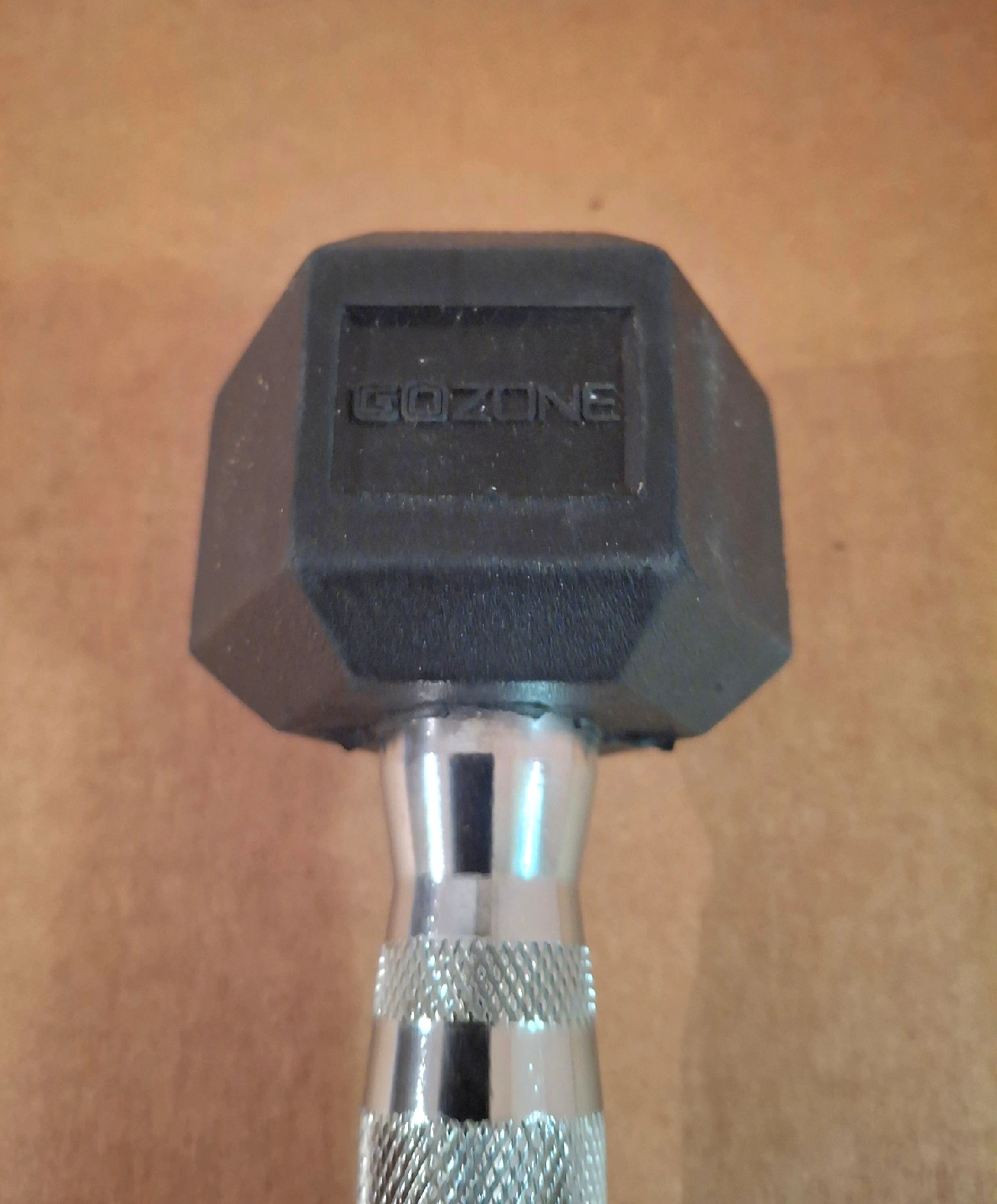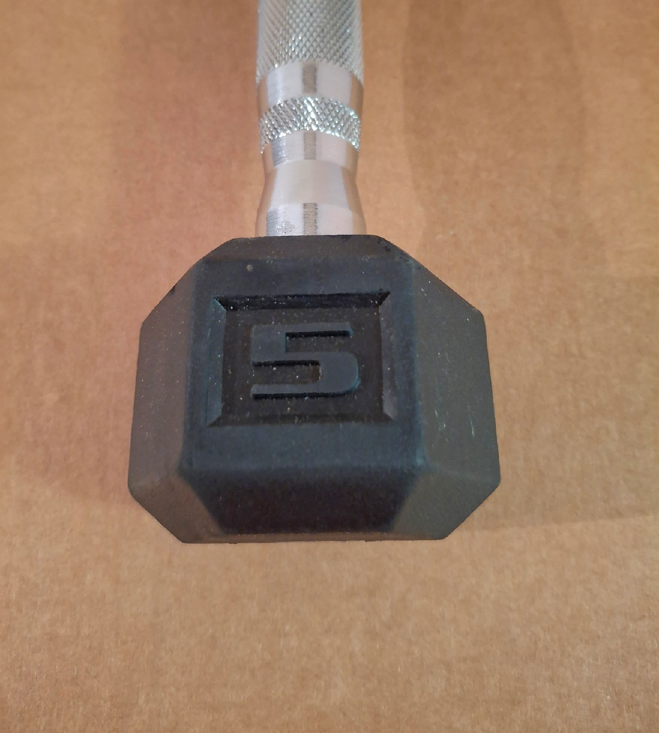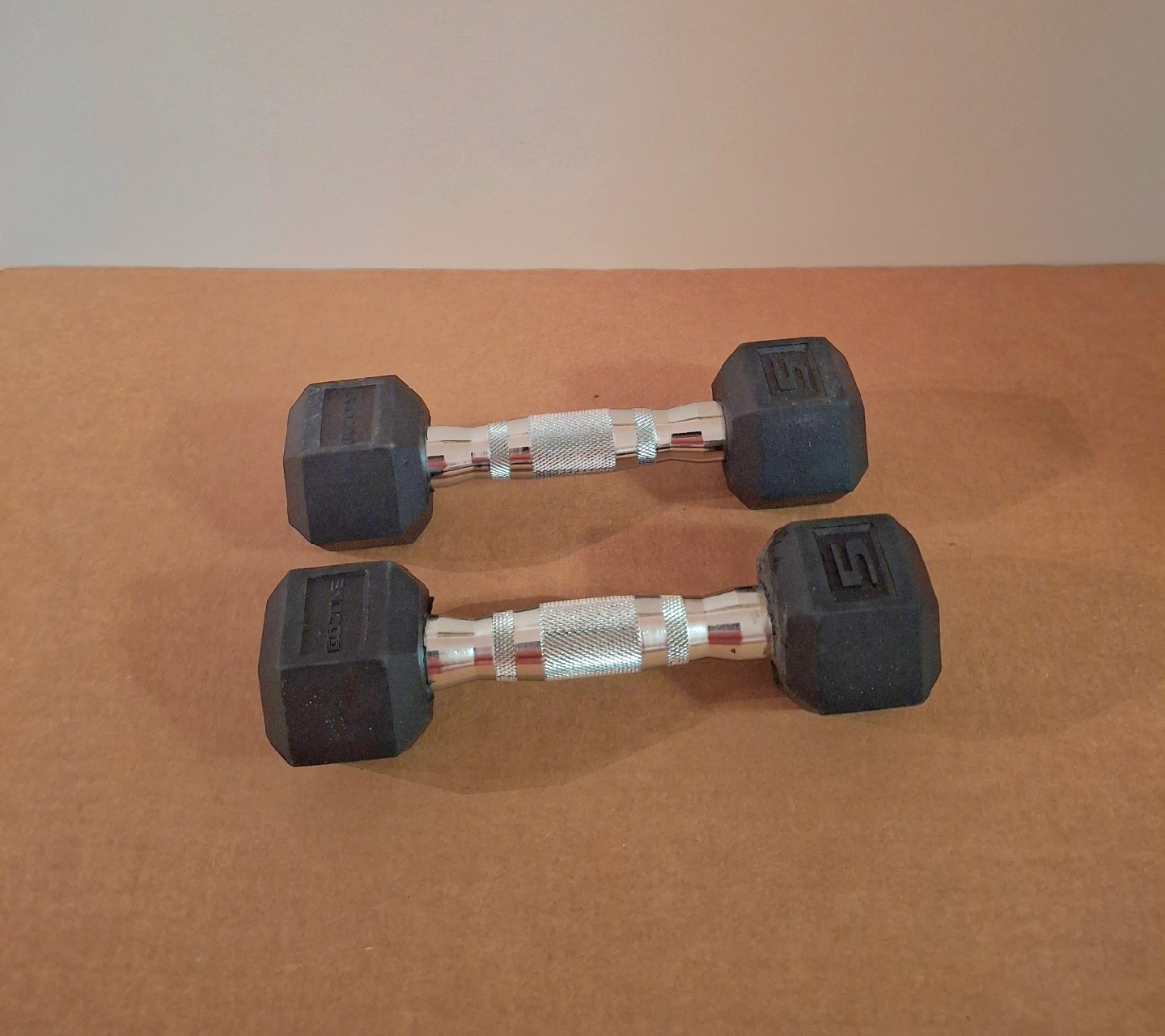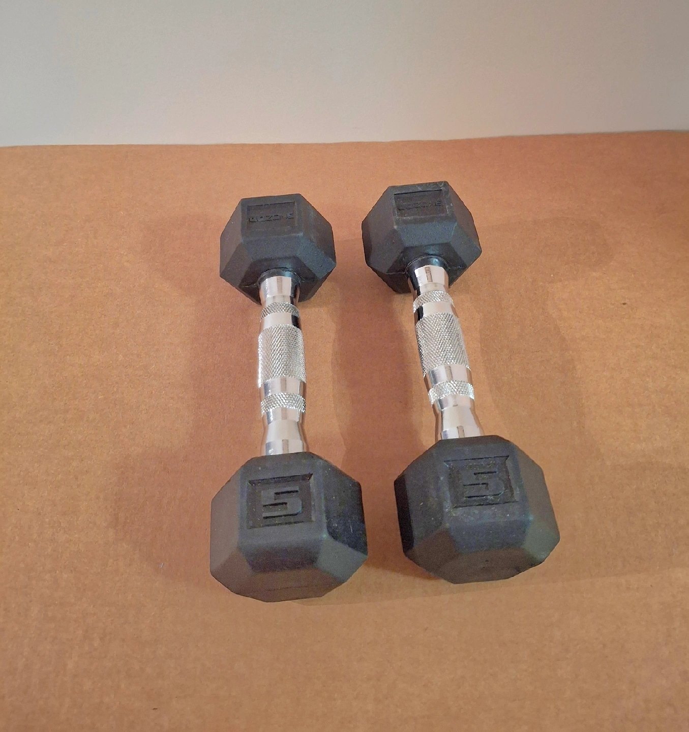 A pair of lightly used 5 LB (2.3KG) GOZONE rubber-coated HEX dumbbells for just $16. Length: 9.5" Available for PICK UP near Celebration Square in Square One Mississauga.