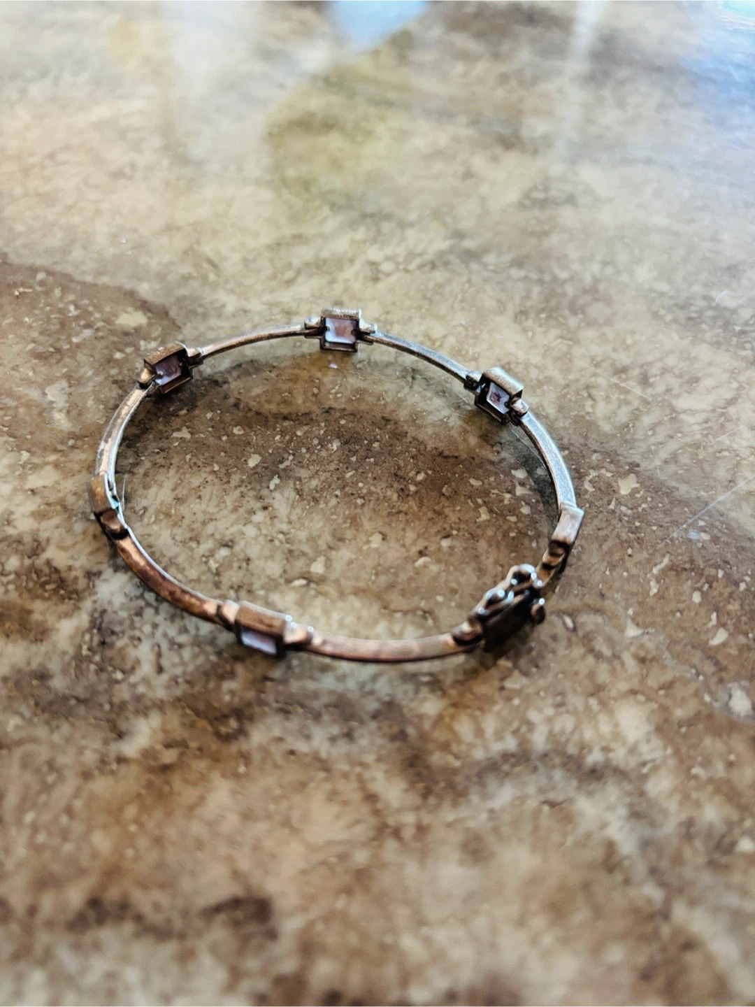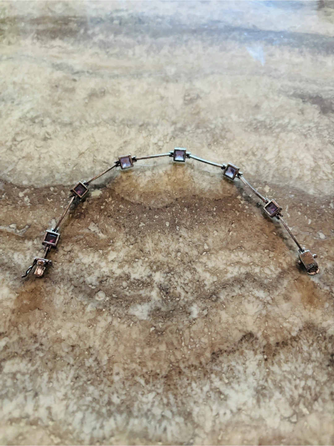A lovely bracelet featuring small purple crystals set in silver. It's in great condition and ready to add a touch of elegance to any outfit! 7.75 inches.