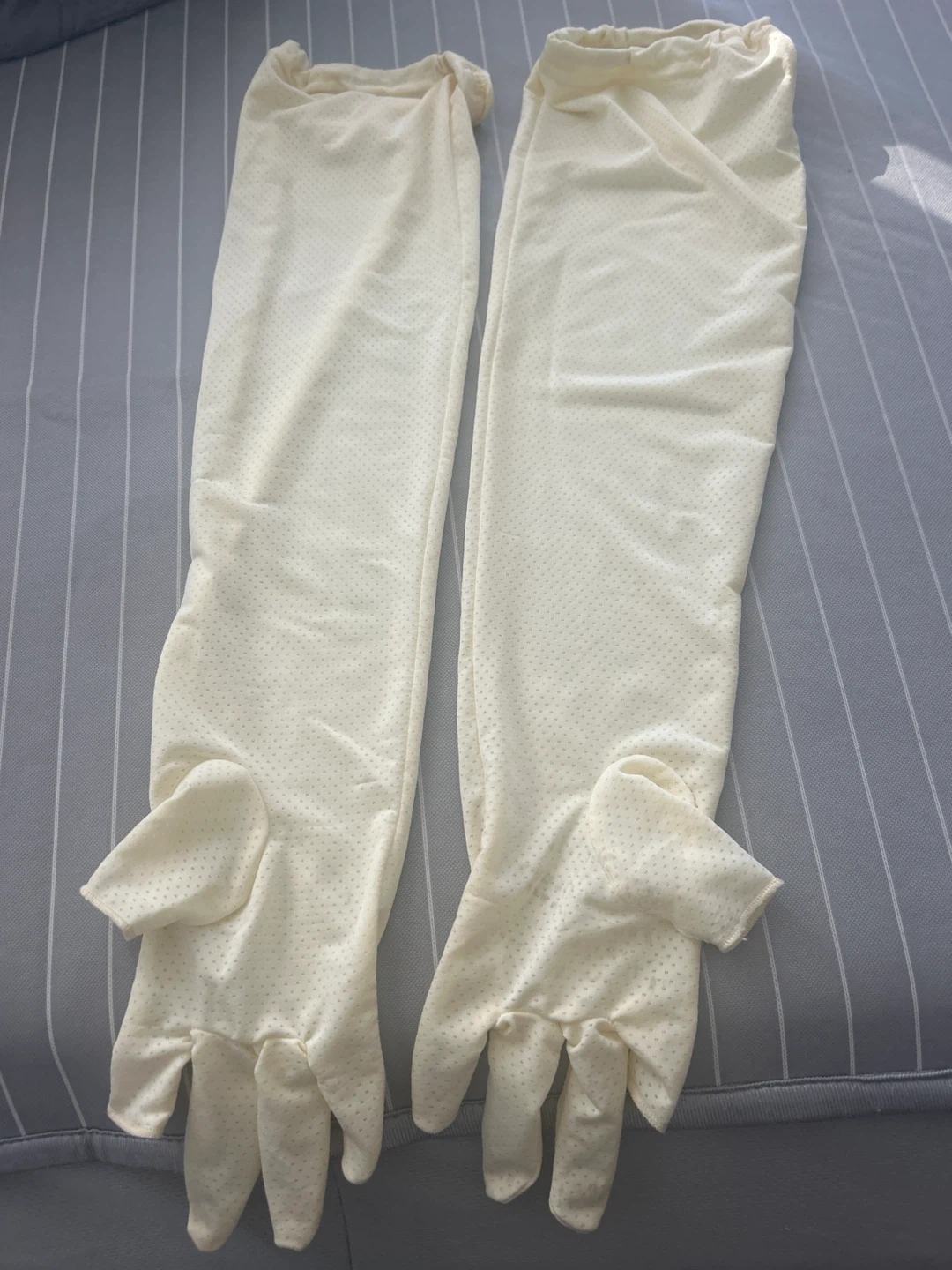 Keep your arms protected from the sun with these beige arm sleeves. They're lightweight and comfortable, perfect for outdoor activities