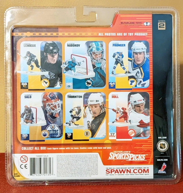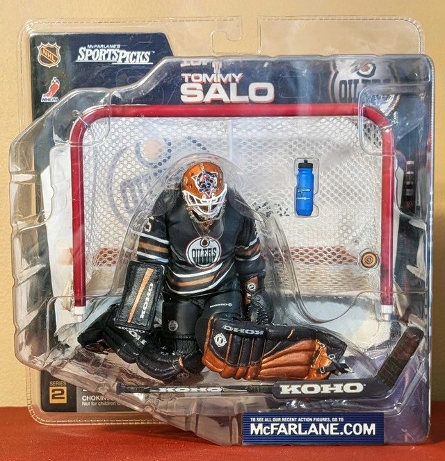 If you are seeing this Ad, then this item is still available This sale is for 1 very nice and clean NEW - McFarlane - Series 4 - Tommy Salo - Edmonto Oilers - Black Jersey Variant Action Figure. The McFarlane Series 4 - Tommy Salo - Edmonton Oilers (Black Jersey Variant) was released in 2003. This figure captures Tommy Salo in his goaltending stance, wearing the black Edmonton Oilers jersey, which was a chase variant—making it rarer than the standard white jersey version Key Features: • Highly detailed sculpt replicating Turek’s playing style. • Black Edmonton Oilers jersey variant, a sought-after collectible • 6-inch scale with realistic equipment details. • Limited availability, making it a prized item for collectors. Pick-up in Pickering ONLY This item comes from a smoke-free home.