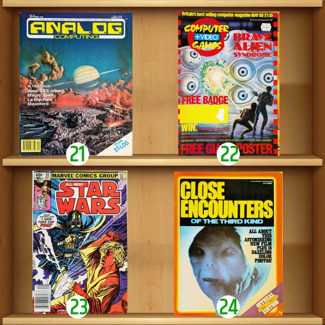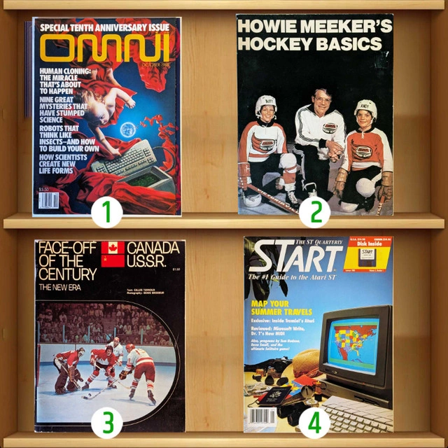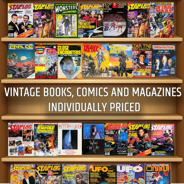 If you are seeing this Ad, then this item is still available This sale is for some very nice and clean Vintage Books, Comics and Magazines -- Individually Priced. Prices are marked and are FIRM. Owning vintage magazines, comics, and books is like having a personal time capsule. Each piece tells a story—not just within its pages, but also of the era it comes from. The smell of old paper, the feel of the worn covers, and the nostalgia they evoke can transport you to a different time. Whether it's the delight of finding rare issues or the joy of preserving history, these collectibles offer a unique glimpse into the past that digital media just can't replicate. For many, it’s about the thrill of the hunt, the stories behind each find, and the connection to a shared cultural history. . Features: 1 OMNI - Special Tenth Anniversary Issue (October 1988) - $ 20.00 2 Howie Meeker's Hockey Basics (1973) - $ 20.00 3 Face-Off of the Century The New Era (1972) - $ 20.00 4 Atari STart - ST Quarterly (Missing Disk) (Volume 3, Number 1) - $ 20.00 5 SAGA UFO Report (January 1978) - $ 25.00 6 Official UFO (January 1978) - $ 25.00 7 Starlog (Number 54 - January 1982) - $ 10.00 8 Starlog (Number 59 - June 1982) - $ 10.00 9 Starlog (Number 58 - May 1982) - $ 10.00 10 Starlog (Number 134 - September 1988) - $ 10.00 11 Starlog (Number 60 - July 1988) - $ 10.00 12 Starlog (Number 61 - August 1982) - $ 10.00 13 Starlog (Number 62 - September 1982) - $ 10.00 14 Star Wars: The Empire Strikes Back Official Collectors Edition (1980) - $ 30.00 15 Star Wars: Return of the Jedi Offical Collectors Edition (1983) - $ 30.00 16 Pink Floyd The Wall Pictures from the Movie with Lyrics (1982) - $ 25.00 17 Heavy Metal (June 1982) - $ 25.00 18 Heavy Metal (July 1982) - $ 25.00 19 Cinefantastique (September 1990) - $ 20.00 20 Star Trek The Magazine (July 1999) - $ 20.00 21 Analog Computing (No. 46 - September 1986) - $ 20.00 22 Computer +_Video Games (May 1988) - $ 20.00 23 Marvel Comics Group - Star Wars (#63 September 1982) - $ 25.00 24 Close Encounters of the Third Kind - Official Authorized Edition (1977) - $ 20.00 25 Monsters Unlimited (#7 1966) - $ 25.00 26 Starlog (Number 139 - February 1989) - $ 10.00 27 Starlog (Number 68 - March 1983) - $ 10.00 28 Starlog (Number 66 - January 1983) - $ 10.00 29 LIFE Magazine (August 1990) - $ 20.00 30 TIME Magazine (July 15, 1985) - SOLD 31 Marvel Fantastic Four (#287 - November 12, 1985) - $ 12.00 32 Marvel Fantastic Four (#350 - January 22, 1991) - $ 12.00 33 Marvel Fantastic Four (#253 - January 18, 1983) - $ 15.00 Pick-up in Pickering ONLY These items come from a smoke-free home.
