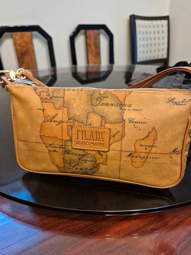 This Alviero Martini Prima Classe mini bag features the iconic world map print, perfect for adding a touch of vintage charm to your outfit. This used bag is in good condition, ready for a new adventure. Here are some details: * Brand: Alviero Martini Prima Classe * Print: World Map * Style: Mini Bag * Closure: Zipper Isn't it fun to think about where this bag has been? If the ad is up, it's still available, so let's make a deal!