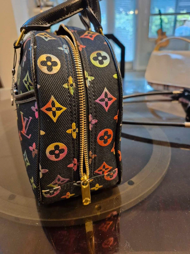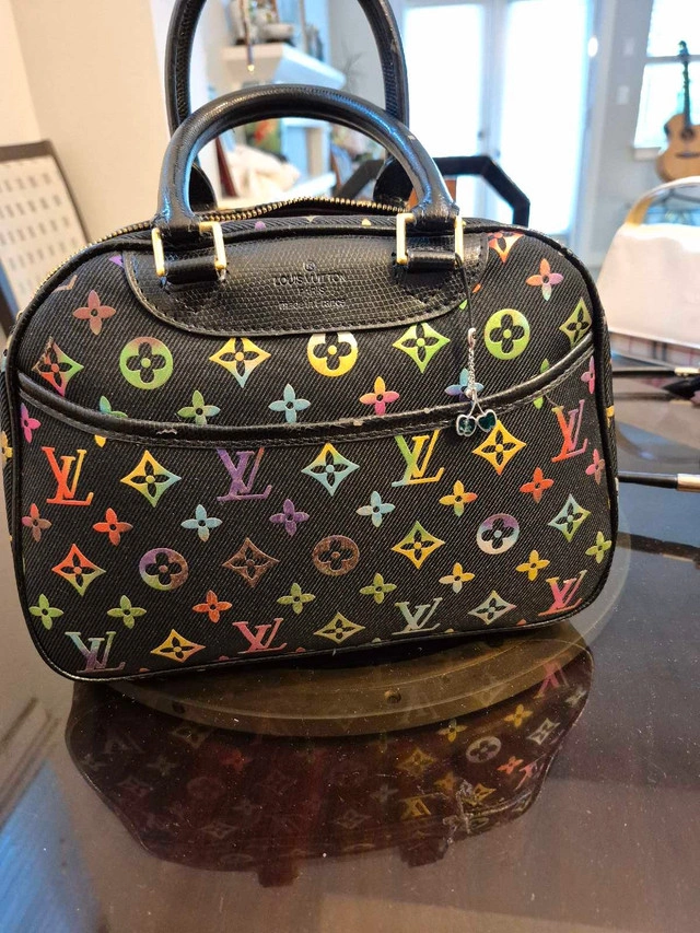 This is a used Louis Vuitton handbag with a unique, colourful monogram design on a black background. It's a stylish accessory, perfect for adding a pop of colour to any outfit. This item shows signs of wear. It's more than just a bag; it's a conversation starter, a statement piece, and a little treasure ready to find a new home. Comparable handbags sell for $800-$1200 on Kijiji.
