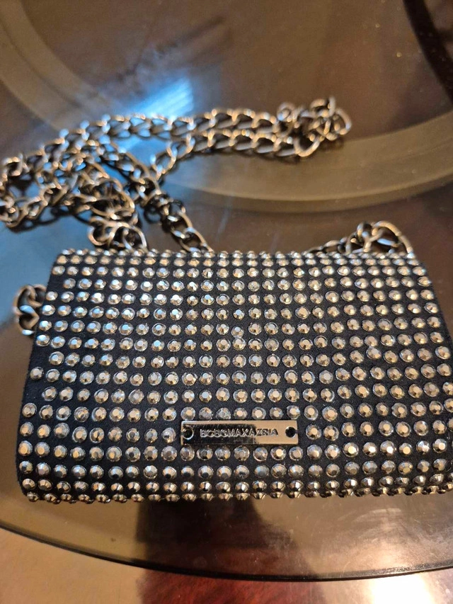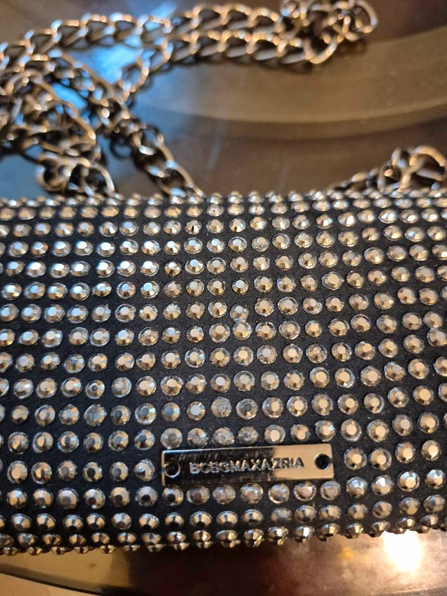 This BCBGMAXAZRIA crossbody bag is adorned with rhinestones and features a chain strap. It is in good condition, perfect for adding a touch of sparkle to your outfit. * Brand: BCBGMAXAZRIA * Style: Crossbody * Colour: Black with silver rhinestones * Strap: Chain Looking to add a bit of sparkle to your life? This bag could be just the ticket! Remember, if the ad is up, it's still available! I've checked prices for similar rhinestone crossbody bags on Kijiji, and they typically range from $20 to $50. Given the brand and condition, I'm pricing this one at $35.