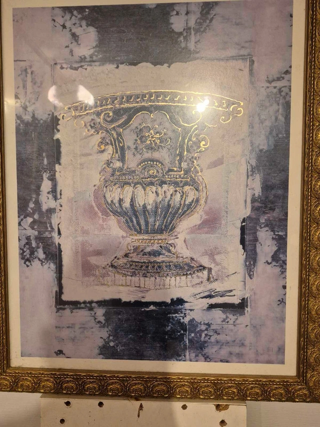 This framed print features an elegant urn design, perfect for adding a touch of classic art to your home decor. The piece is in good condition, with a decorative gold-tone frame that complements the artwork. It is not new, but it looks great!