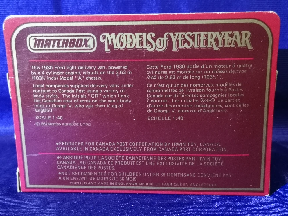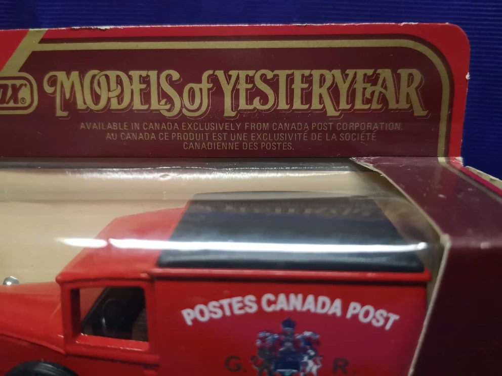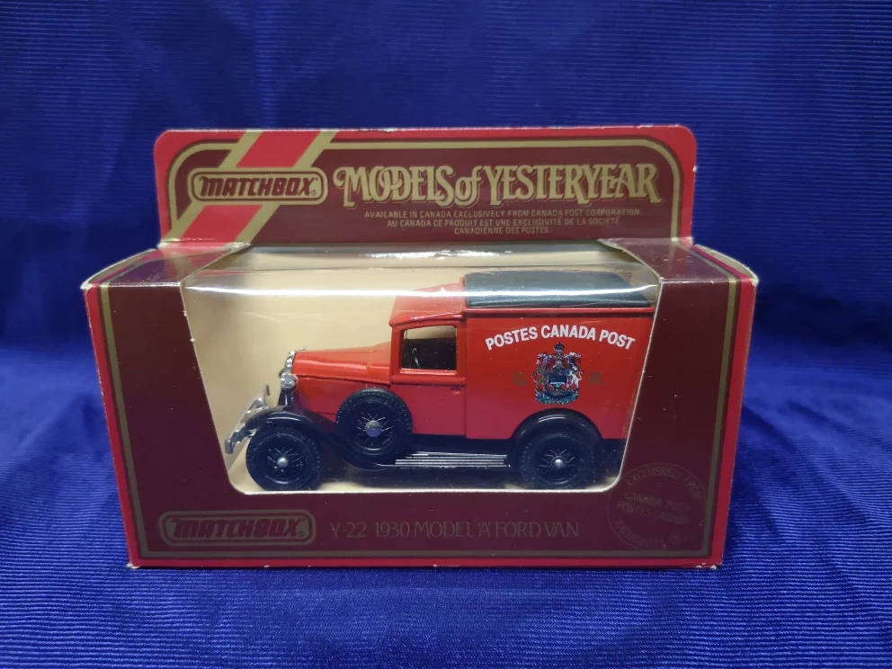 This is a Matchbox Models of Yesteryear Y-22 1930 Model A Ford Van, specifically a special edition featuring Canada Post livery + Crest - Model: Matchbox Models of Yesteryear Y-22 1930 Model A Ford Van. - Special Edition: Canada Post/Postes Canada livery, indicating it was exclusively available through Canada Post Corporation at the time of release. - Scale: 1:40 scale for this particular model. - Produced by: Irwin Toys Canada - Collectibility: A vintage diecast model, appealing to collectors of Matchbox Models of Yesteryear and Ford Model A enthusiasts. - Condition: New + NRFP (Never Removed From Packaging). - Pickup in NW Calgary. - Shipping is an option if you desire.
