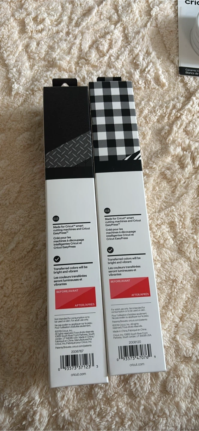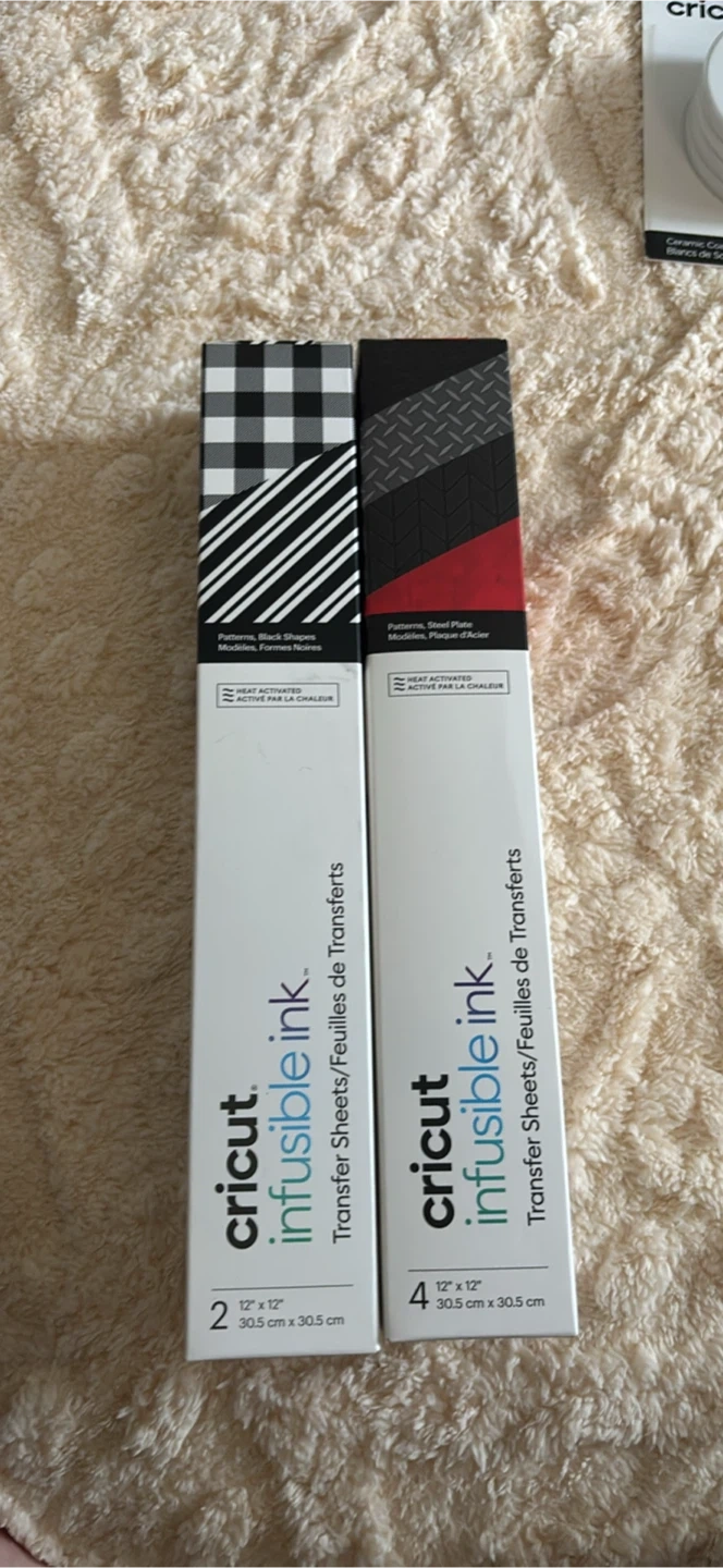 I have some Cricut Infusible Ink Transfer Sheets available! - One package of 2 sheets in a black and white pattern. - One package of 4 sheets in a black and red pattern. Both are sized at 12" x 12" (30.5 cm x 30.5 cm). 8$ each or both for 15$
