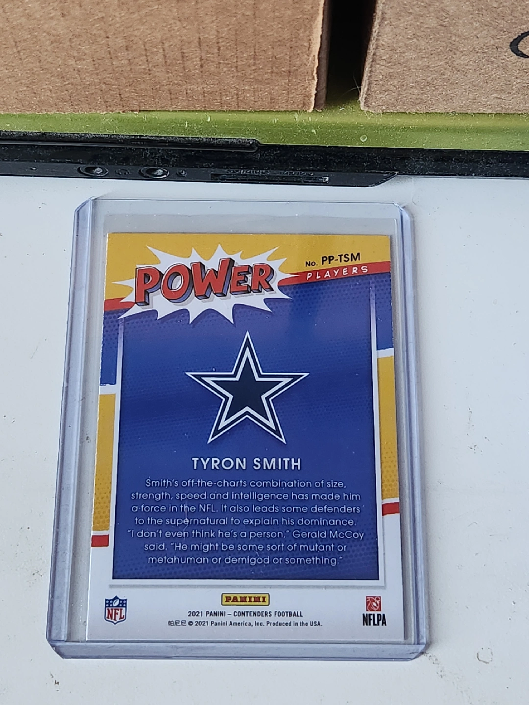 Selling a Tyron Smith football card from the 2021 Panini Contenders series. It's a Power Players card, featuring Tyron Smith of the Dallas Cowboys. Great for any football card collector