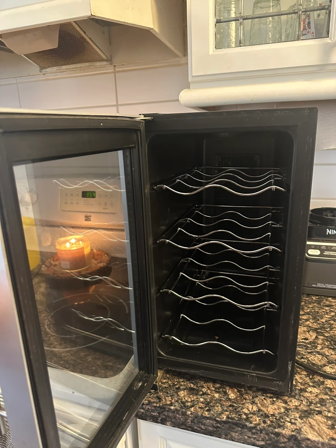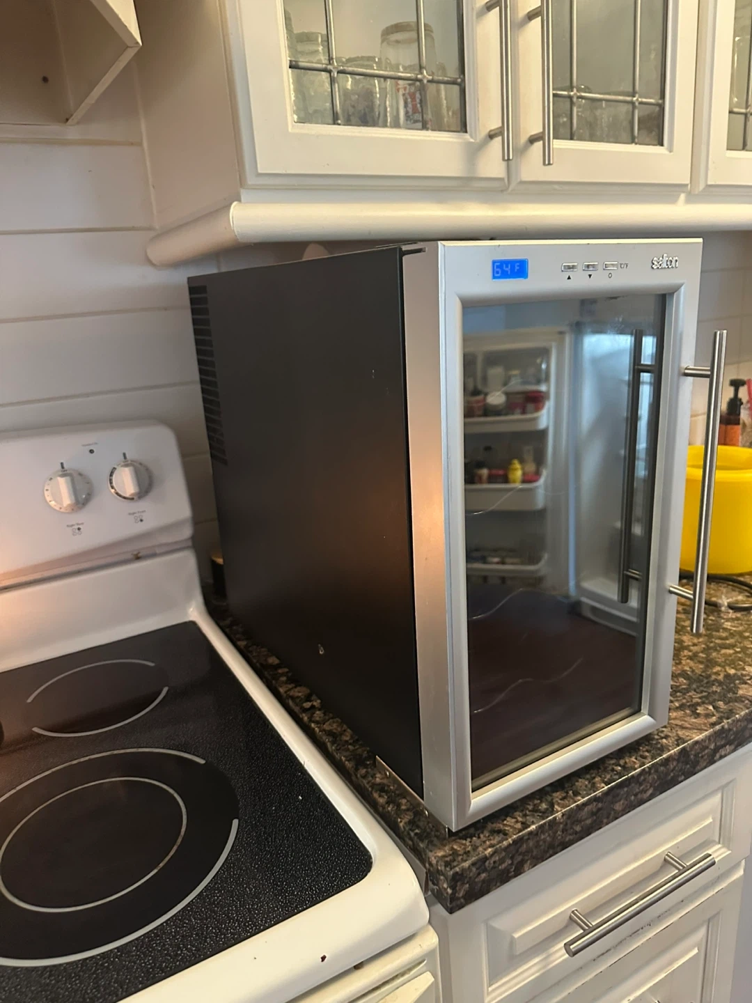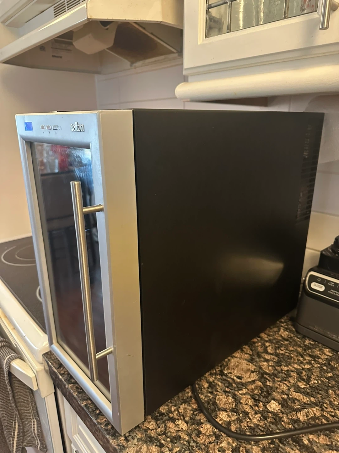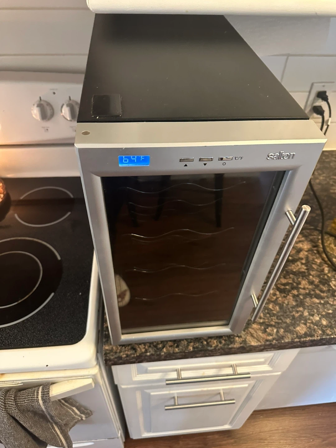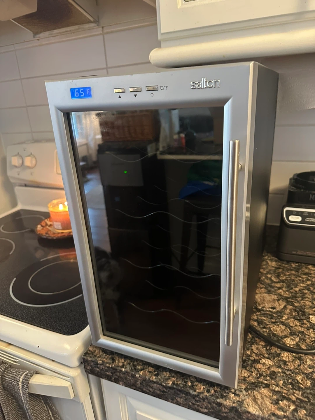 Salton Wine Cooler Temperature Adjustable Holds 8 Bottles Selling a Salton wine cooler. It's in great shape and ready to keep your favourite bottles chilled. Perfect for a small space or as an extra cooler for entertaining Holds 8 bottles. 10" -wide 20" -deep 17.5' - high