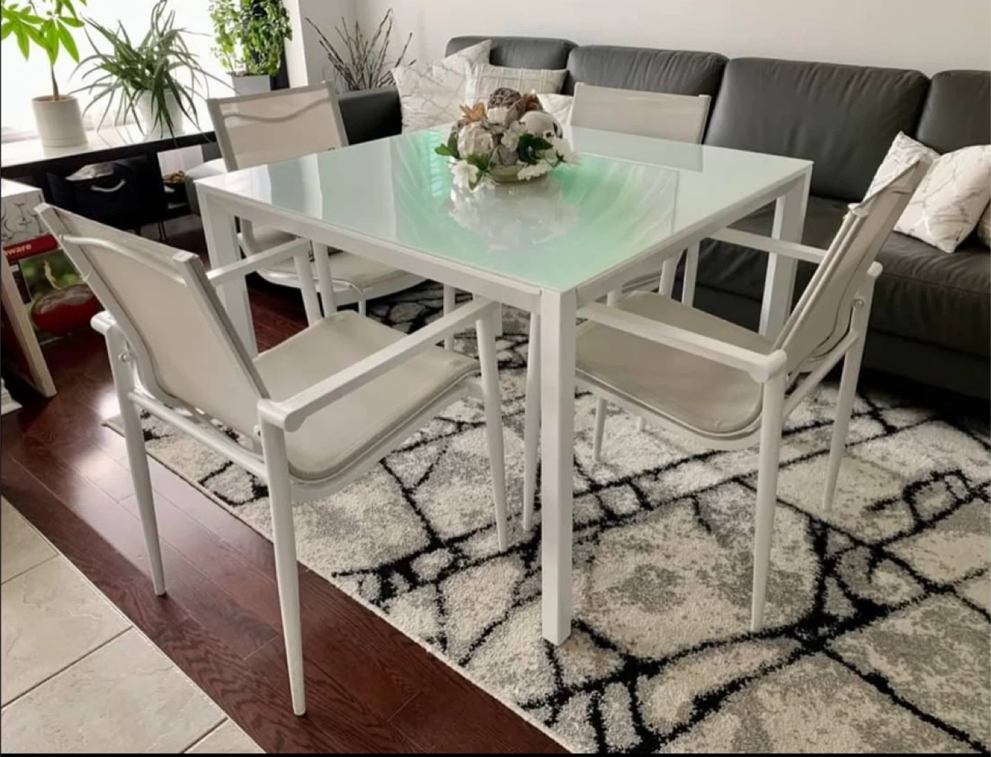 Selling a white dining table with four matching chairs. The set is in brand new condition and would look lovely in any backyard, patio, porch, dining room or kitchen. The table has a glass top and the chairs have a mesh back for comfort. Perfect for family dinners or entertaining guests