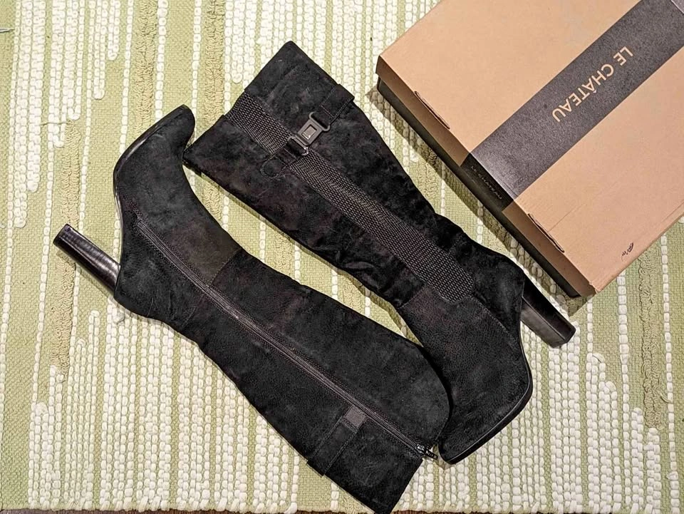 Never worn, brand new velvet boots. Comfortable high heels, very elegant. Brand Le Chateau Size 39 European Retail price 190 + Tax asking less than half price, 80