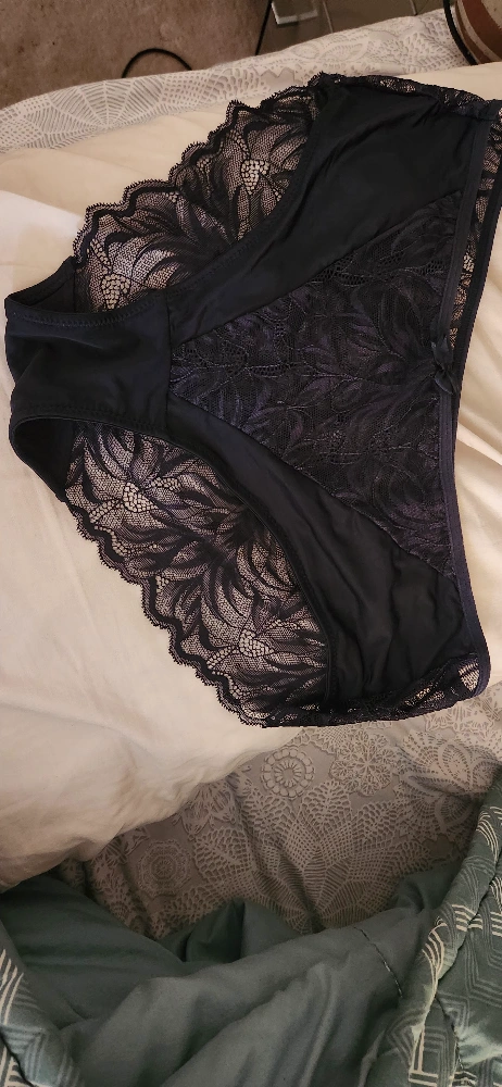 Selling a pair of black underwear with lace detailing.