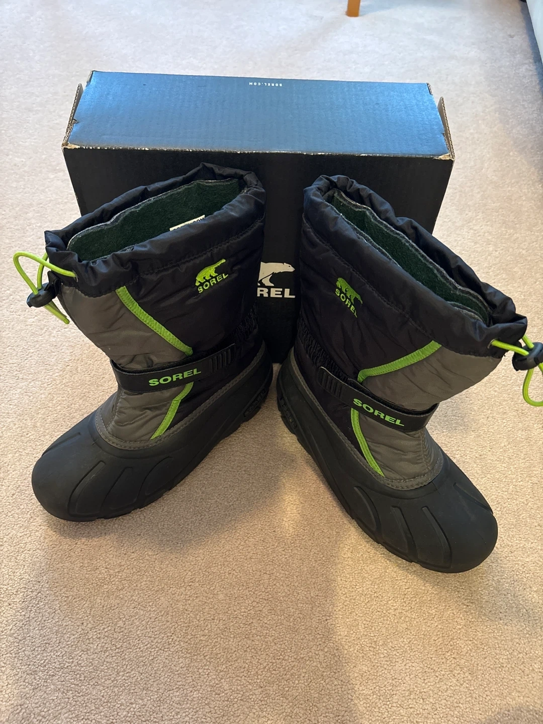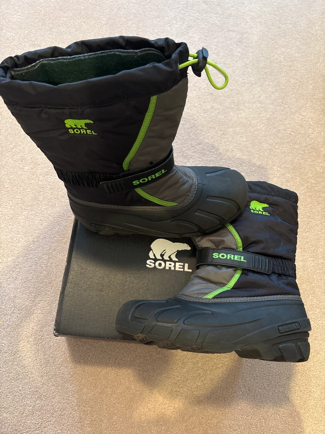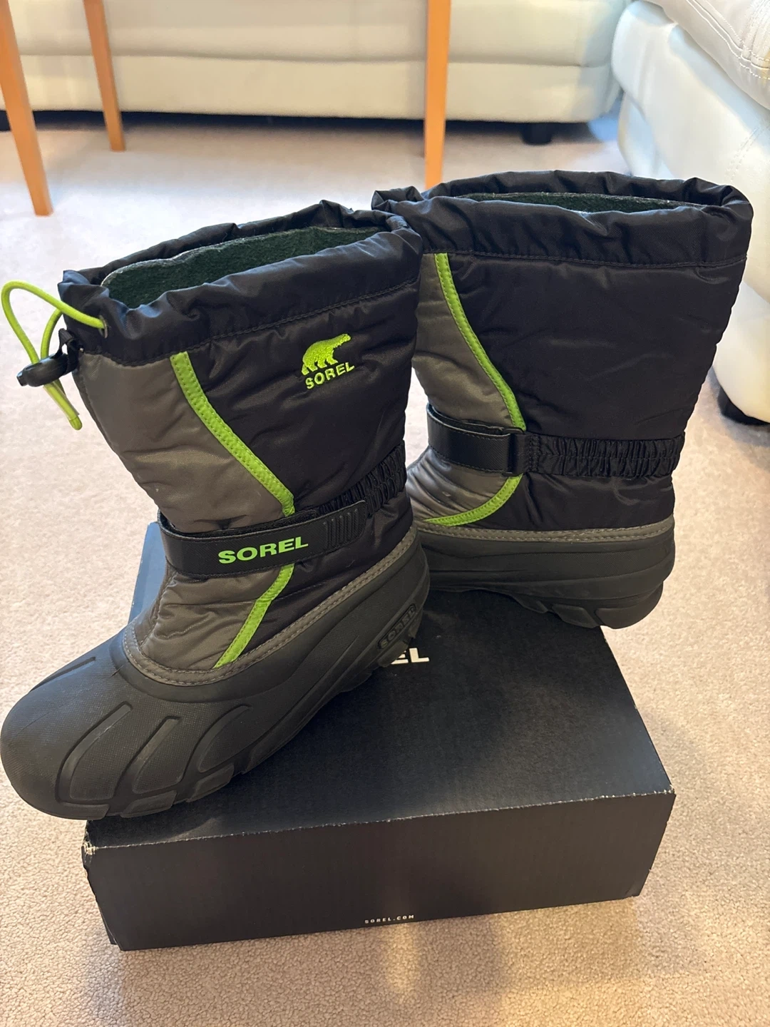 Selling a pair of Sorel Kids' Flurry winter boots in size 6.They are in great condition and come with the original box. These boots are perfect for keeping your little one's feet warm and dry during the winter months!