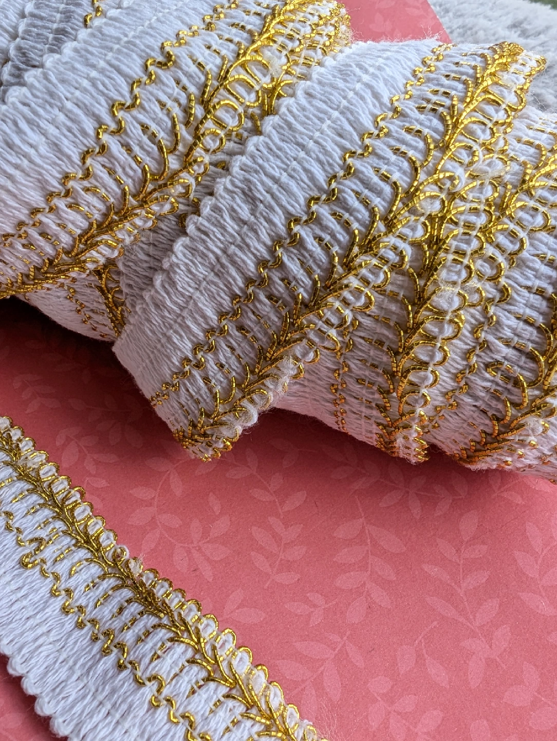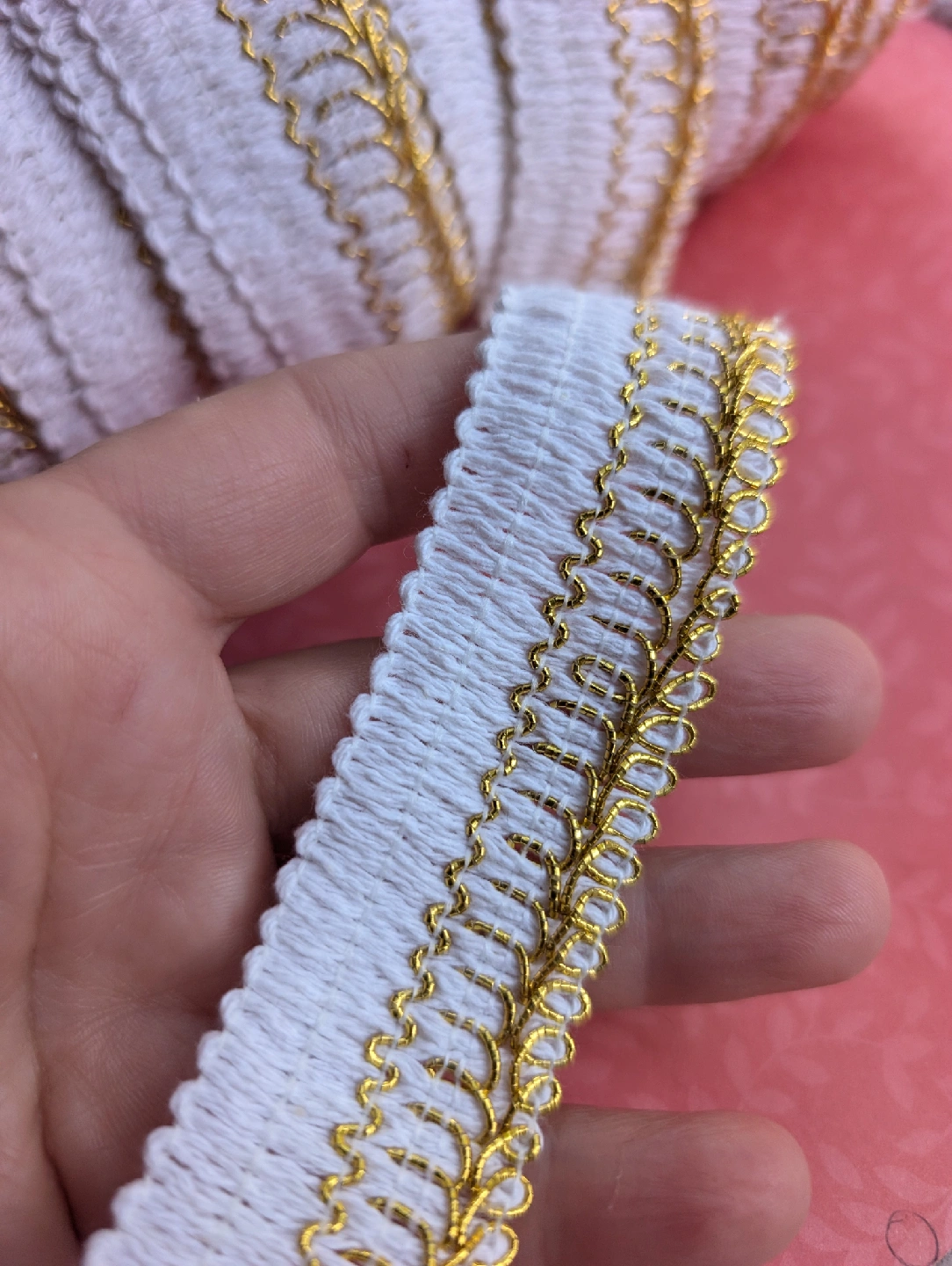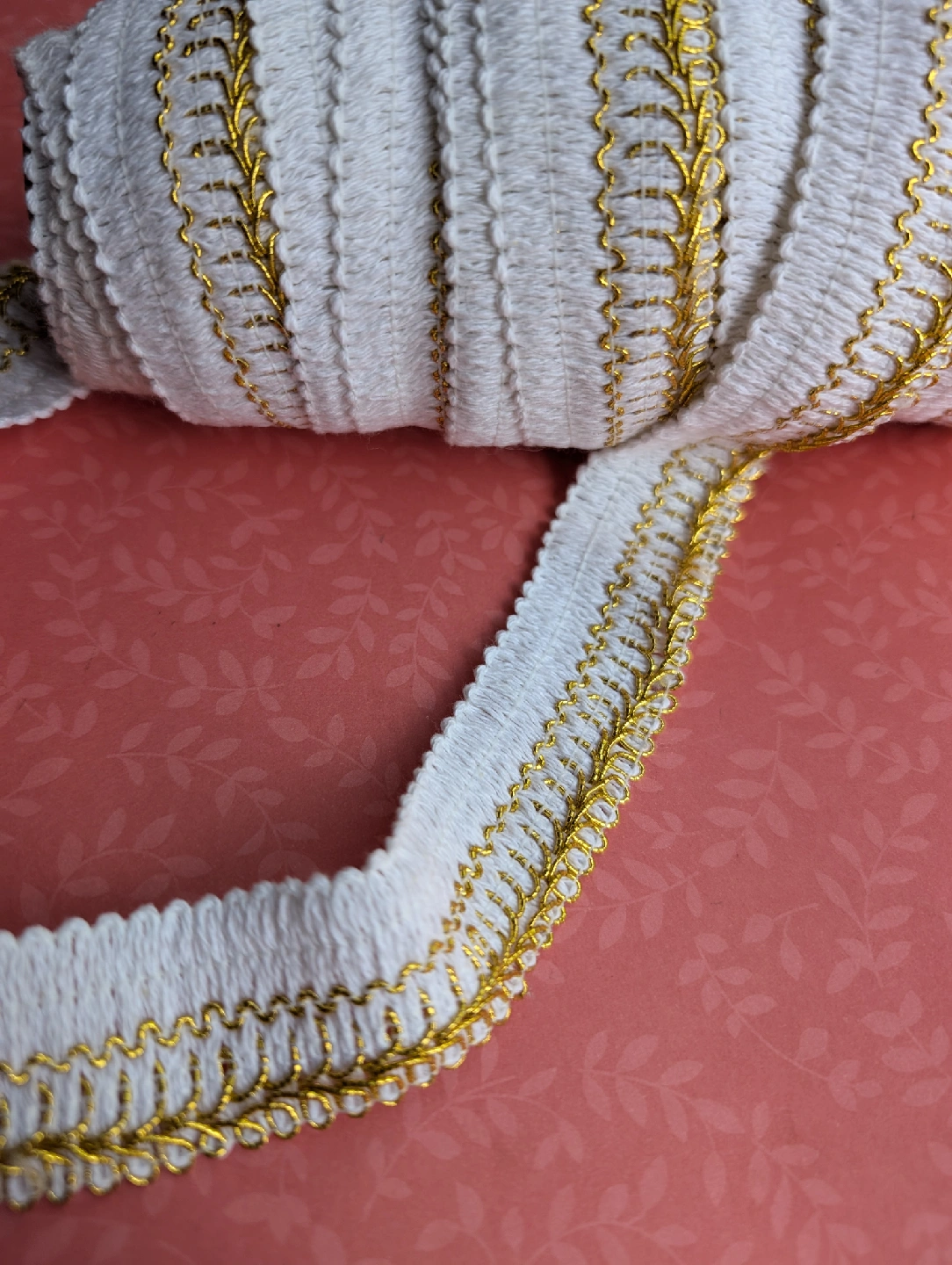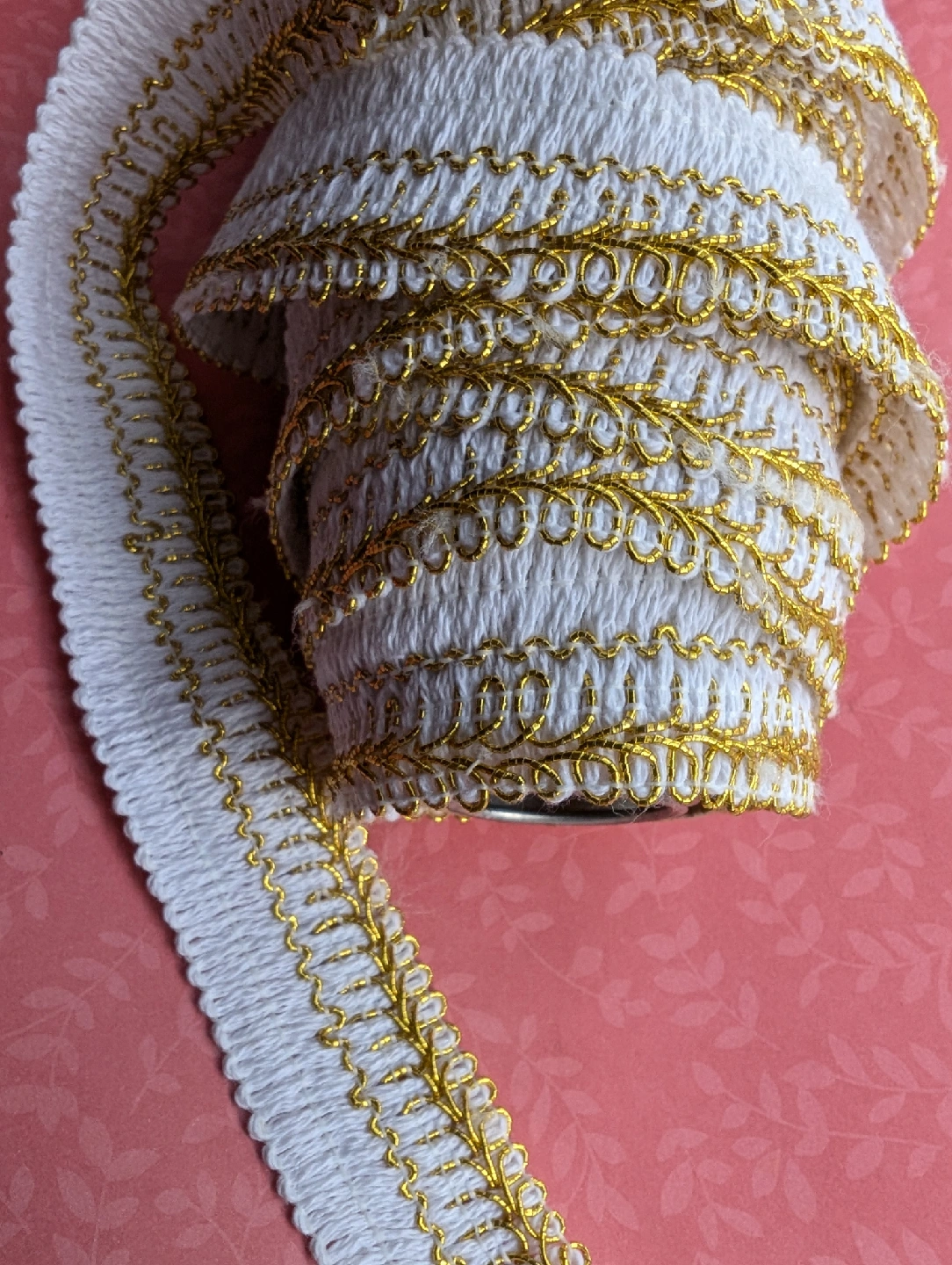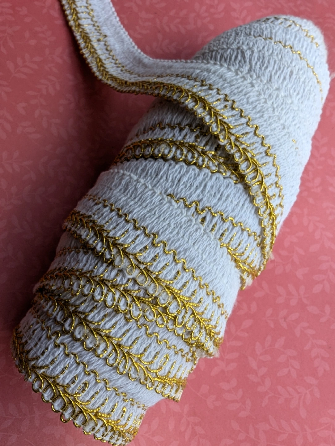 NINE YARDS of a roll of decorative trim featuring white fabric with a gold embroidered design. It would be perfect for adding a touch of elegance to any sewing or craft project! Cash only, no etransfers