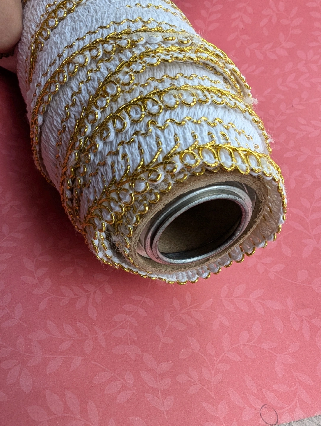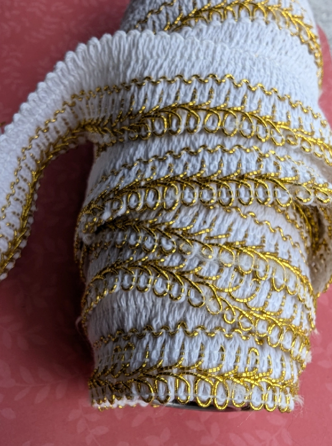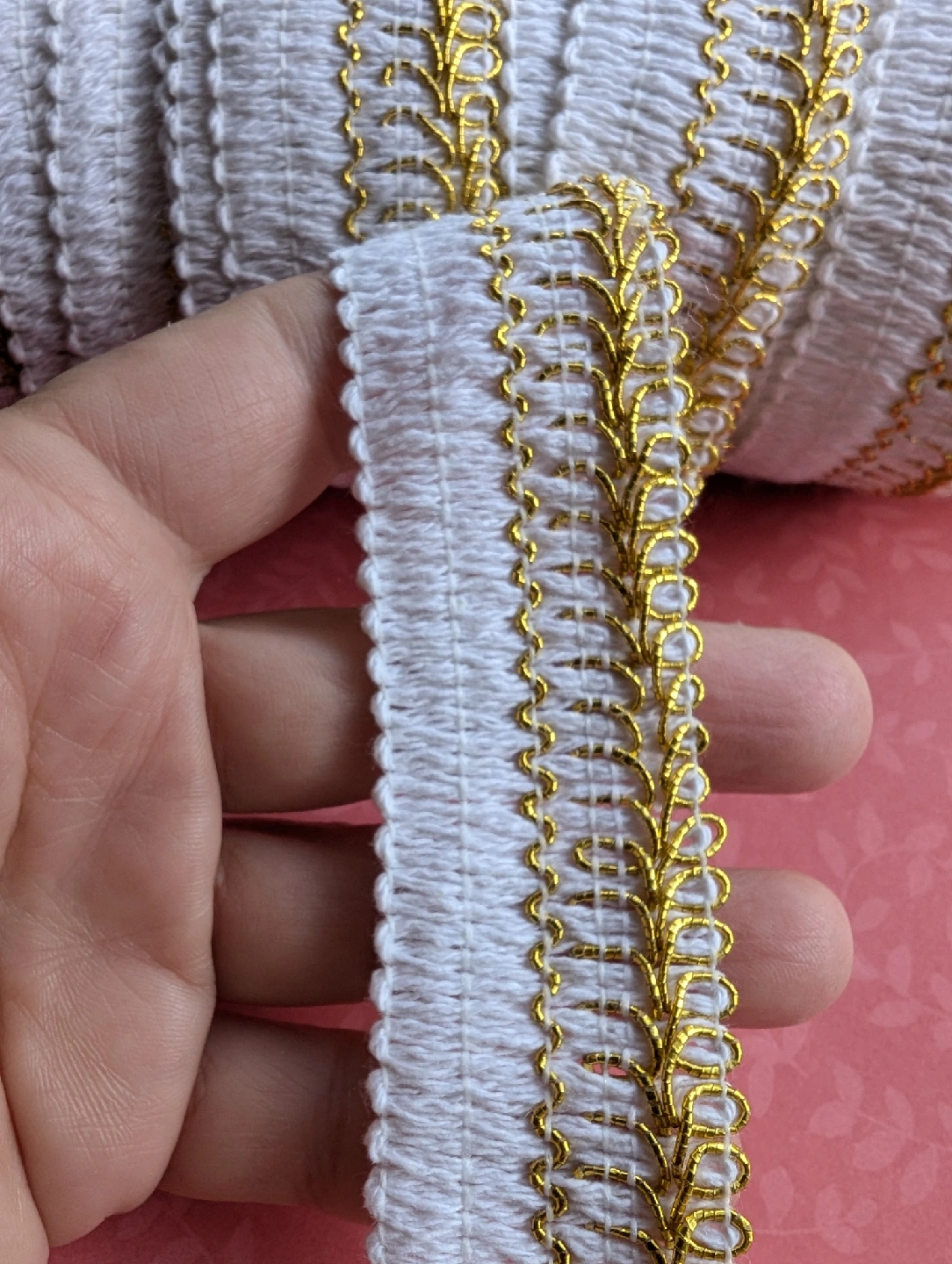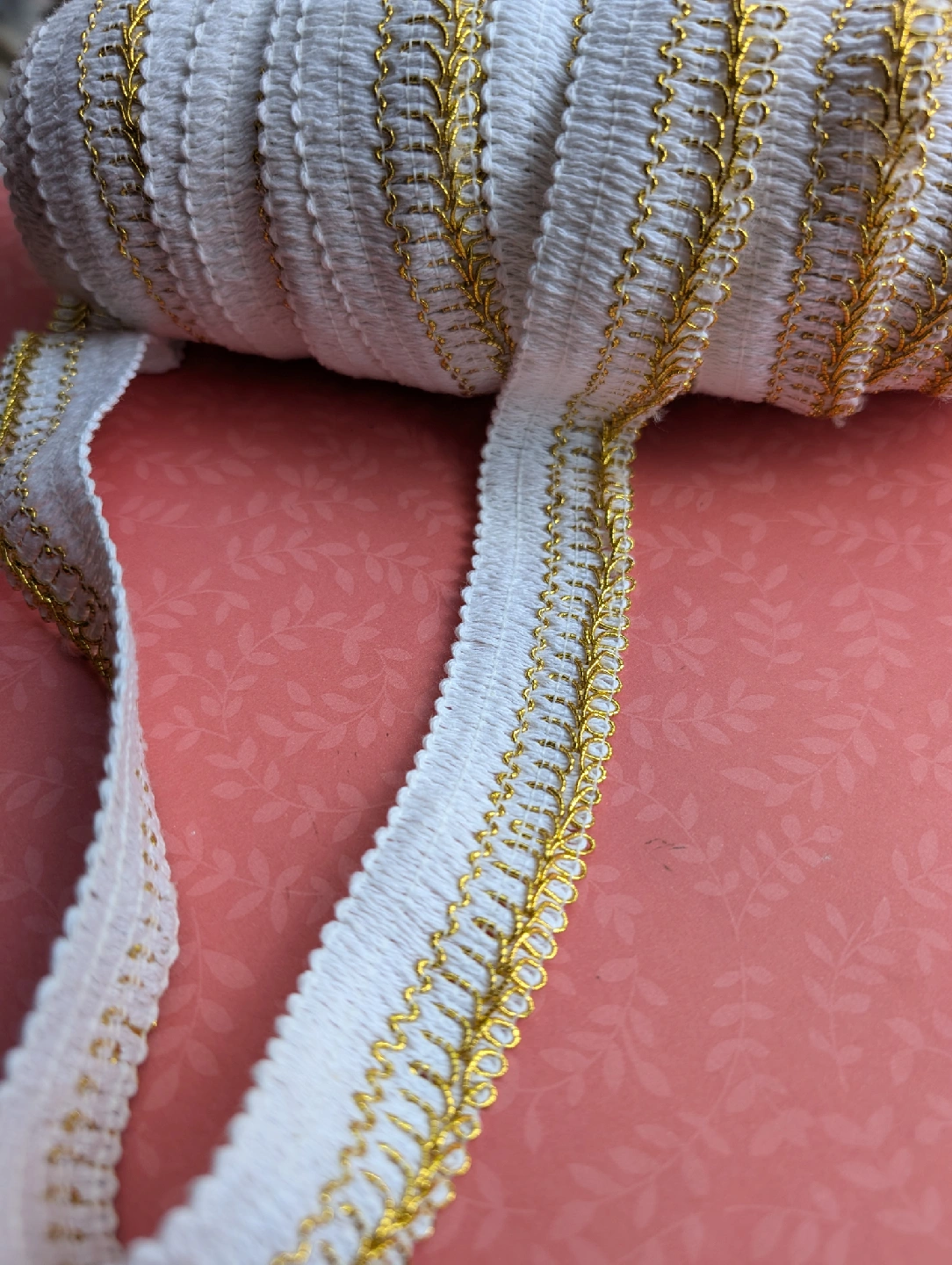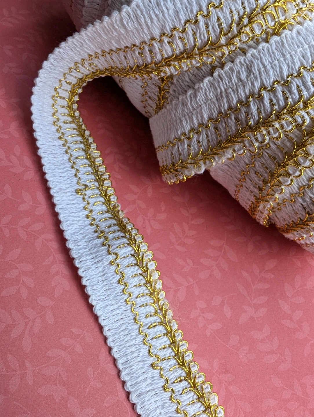 NINE YARDS of a roll of decorative trim featuring white fabric with a gold embroidered design. It would be perfect for adding a touch of elegance to any sewing or craft project! Cash only, no etransfers
