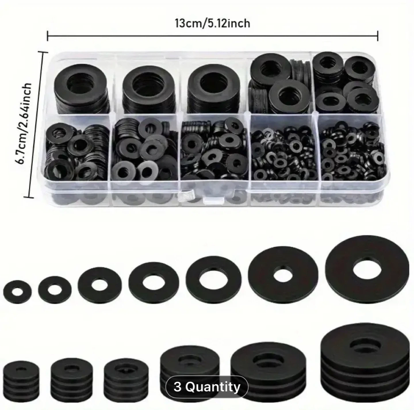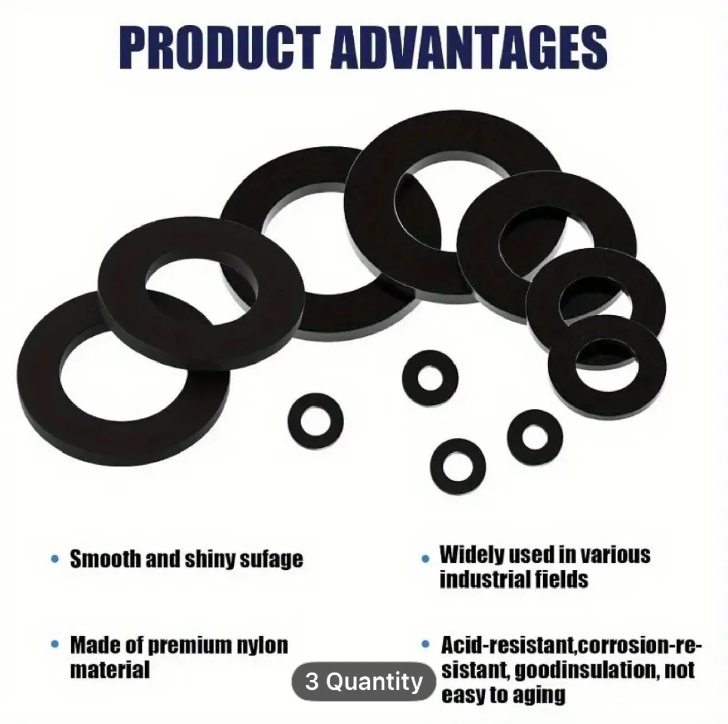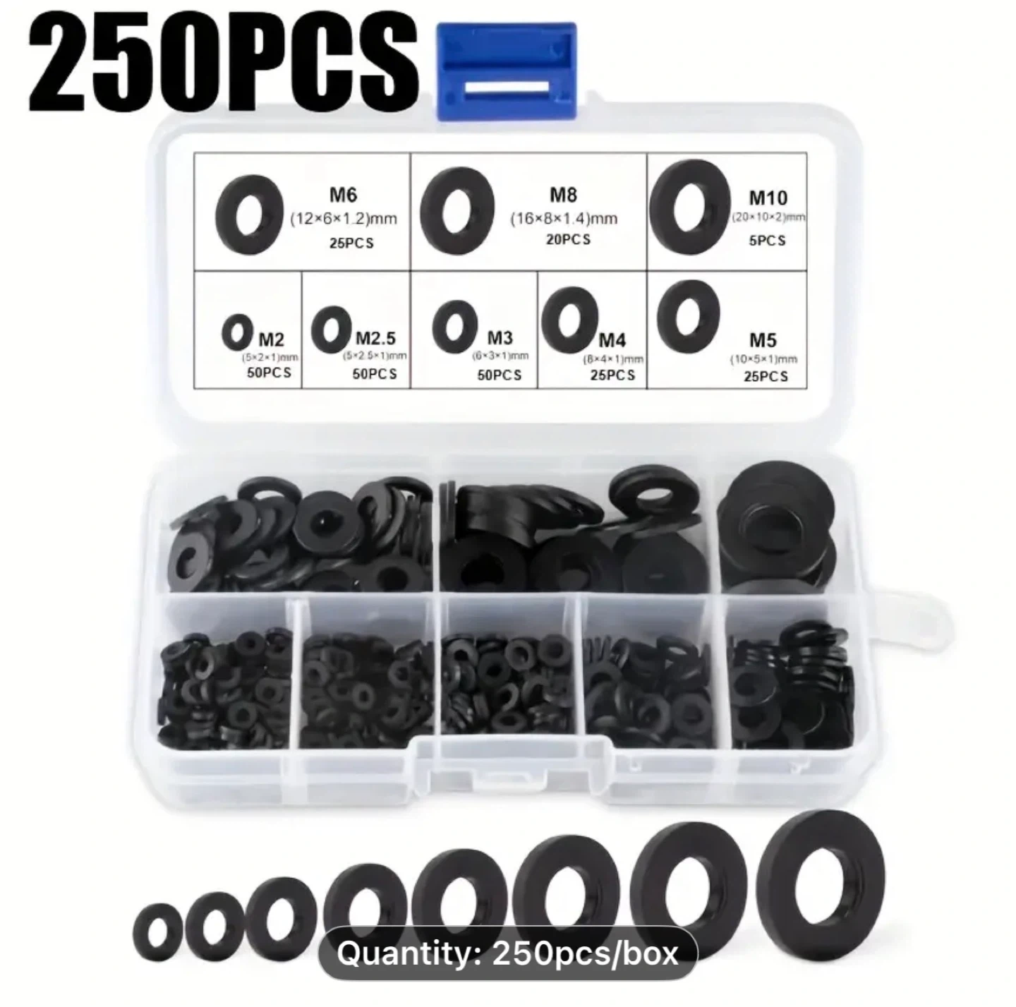 250 pcs Black Nylon Flat Ring Sealing Gasket Set (M2-M10 Sizes) - Heavy-Duty Anti-Loose Plastic Washers with Central Opening, Leak-Proof for Plumbing Repairs, Faucets, Pipes & Water Furniture - Durable & Corrosion-Resistant (Compatible with PVC/CPVC), Faucet Repair, Precision Fit, Highquality Gaskets, DIY Enthusiasts, Maintenance Professionals