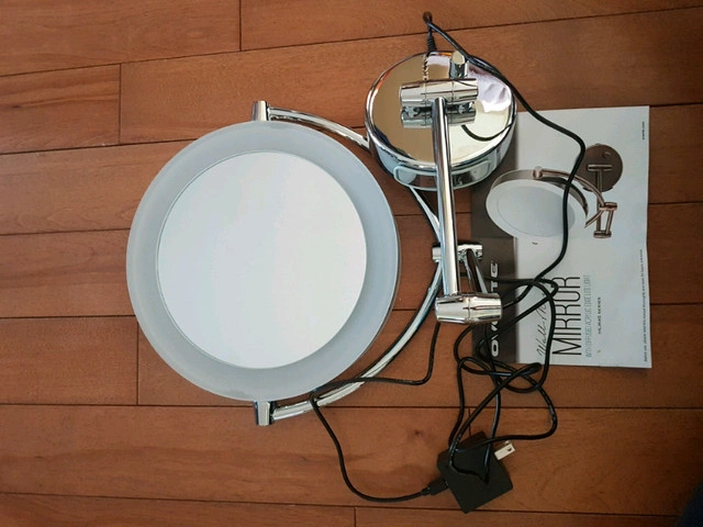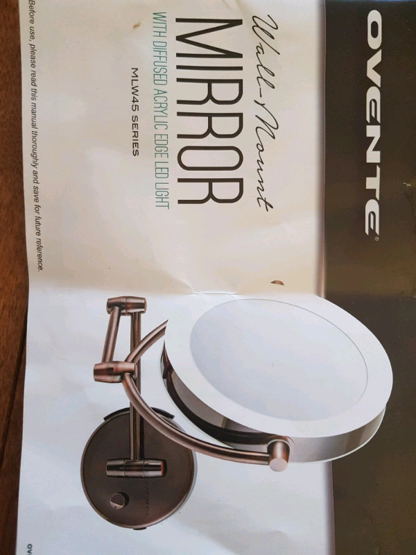 NEW Ovente Wall Mount LED Lighted Makeup Mirror, Battery Operated, 1x/7x Magnification, 7 Inch, Nickel Brush. Opened box but never installed though lost the hardware (mounting plate). Original price $123 on Wayfair.