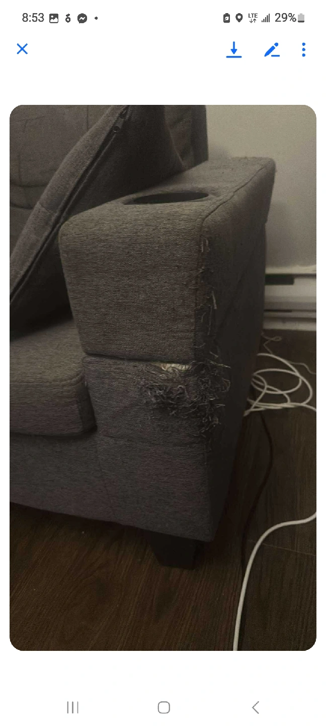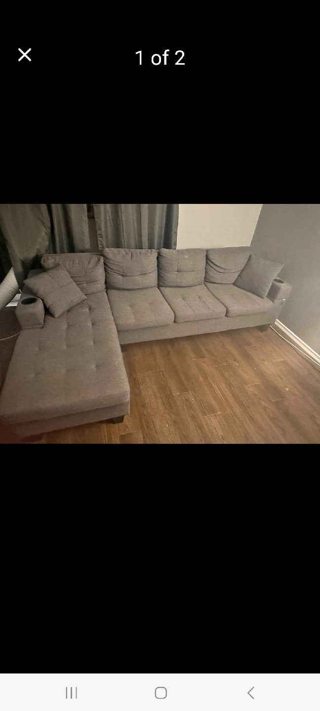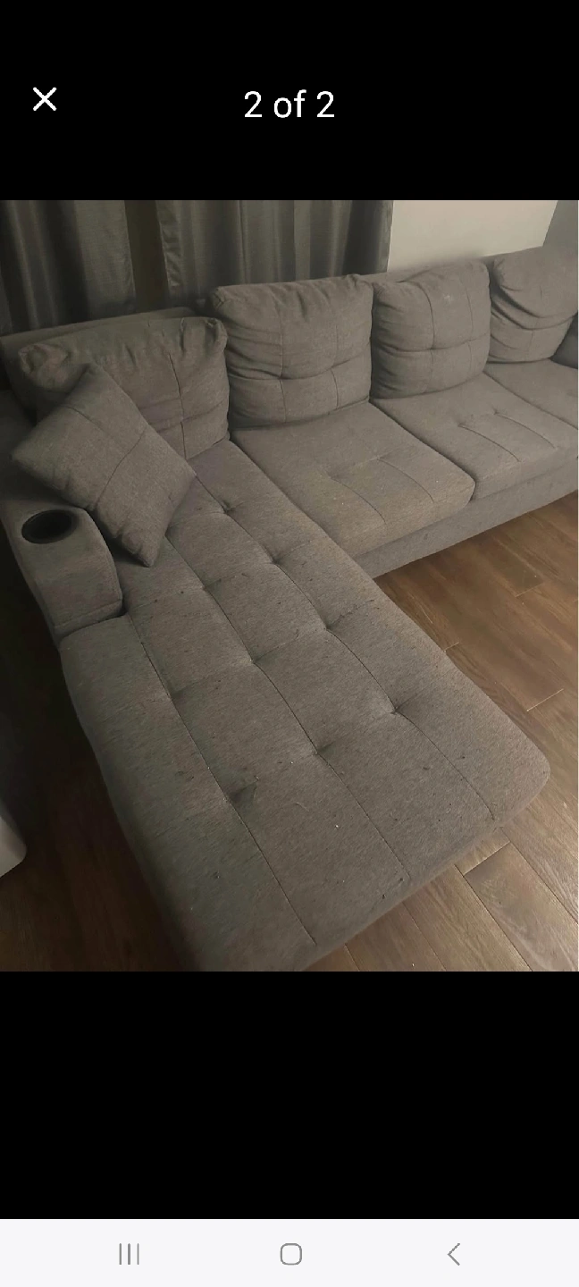 Selling a grey sectional sofa that would be great for a living room or rec room! It features a chaise lounge and a convenient cup holder on the arm. There is some visible wear and tear on one arm, as shown in the pictures.