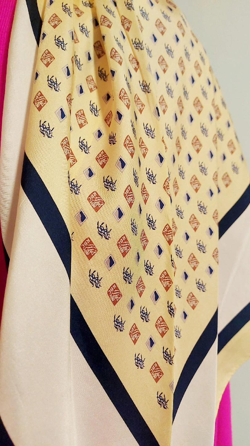 Selling a lovely silk scarf. The scarf features a cream and yellow colour scheme with navy blue accents. It's in great condition and would make a stylish addition to any outfit