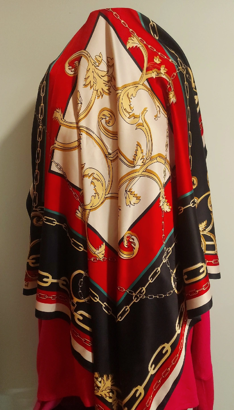 This is a beautiful patterned scarf with a red, black, white, and gold design. It's in great condition and would add a touch of elegance to any outfit. The material feels soft and smooth to the touch, making it comfortable to wear. Perfect for adding a pop of colour and style to your wardrobe