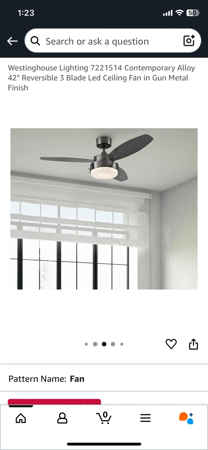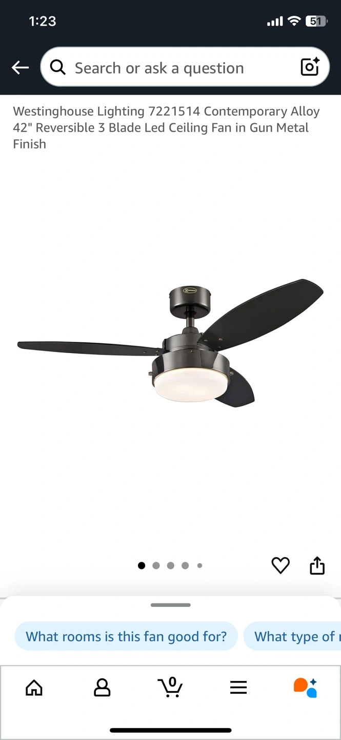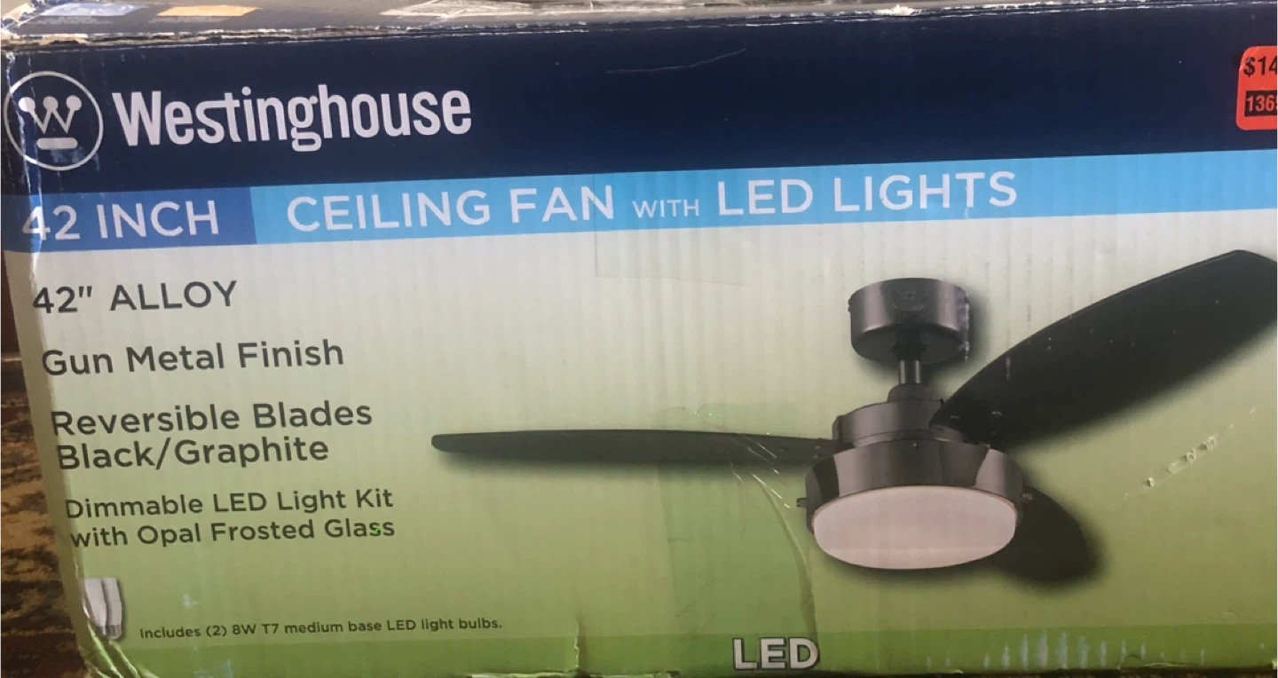 Brand New - Selling a Westinghouse 42-inch ceiling fan! It features a gun metal finish and reversible black/graphite blades. It also has a dimmable LED light kit with opal frosted glass. Includes two 8W T7 medium base LED light bulbs