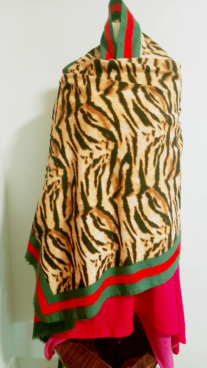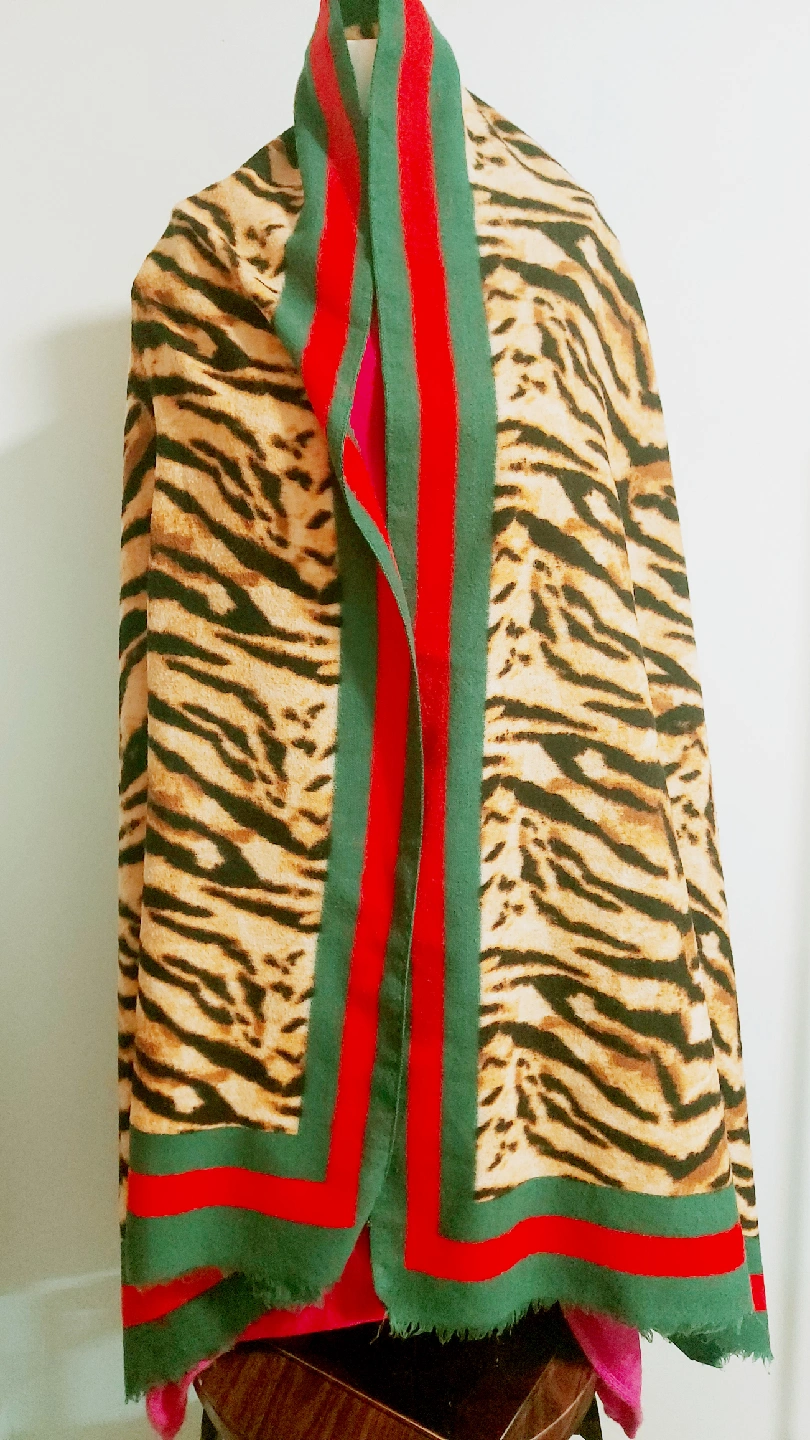 Add a touch of luxury to your wardrobe with this stylish Gucci shawl! It features a bold tiger print design with the classic Gucci stripe detail in red and green. Made from soft wool, it's perfect for adding warmth and flair to any outfit