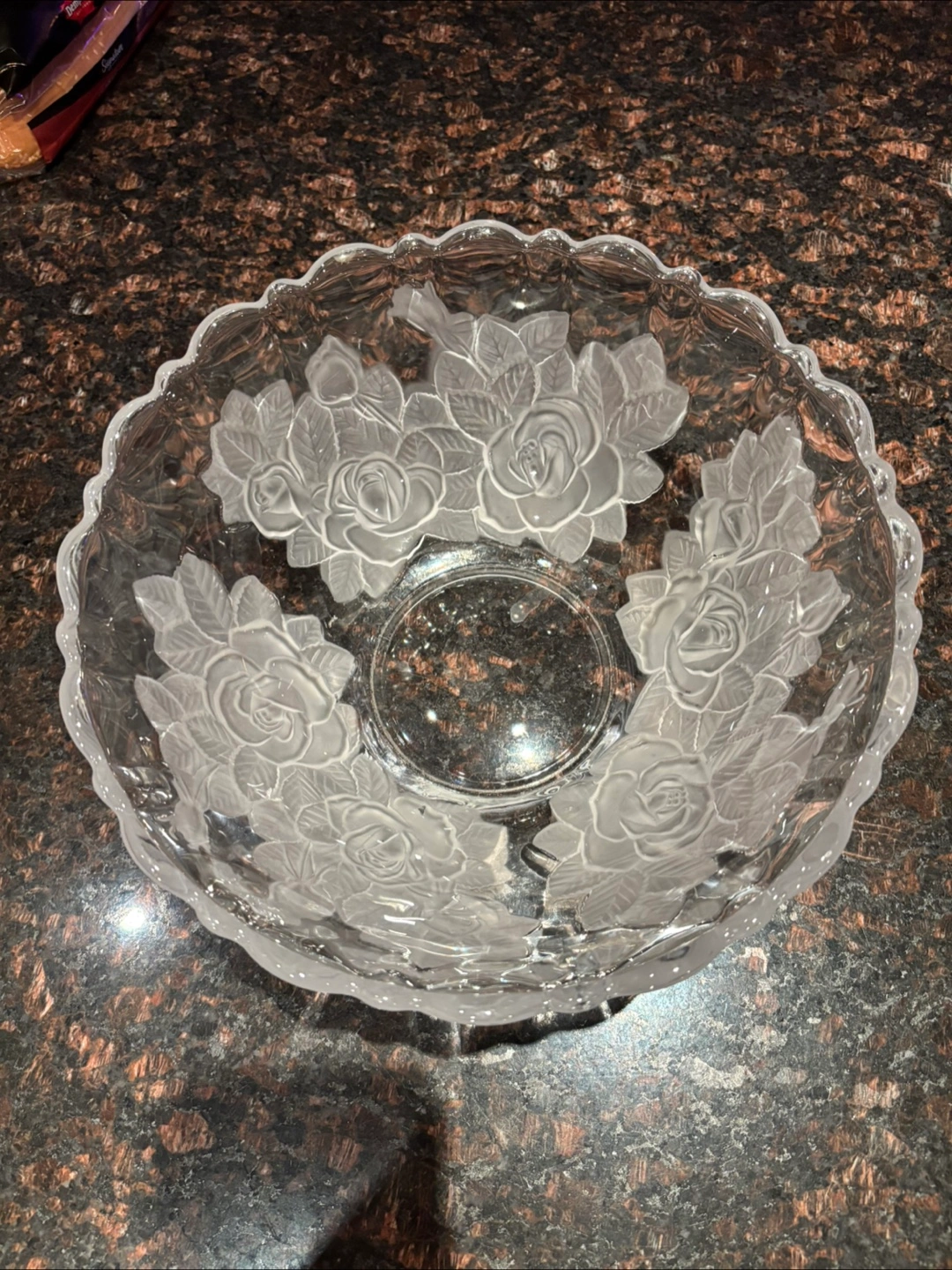 Selling a beautiful MIKASA glass bowl with a lovely floral design. It's in great condition and would be a perfect addition to any table setting