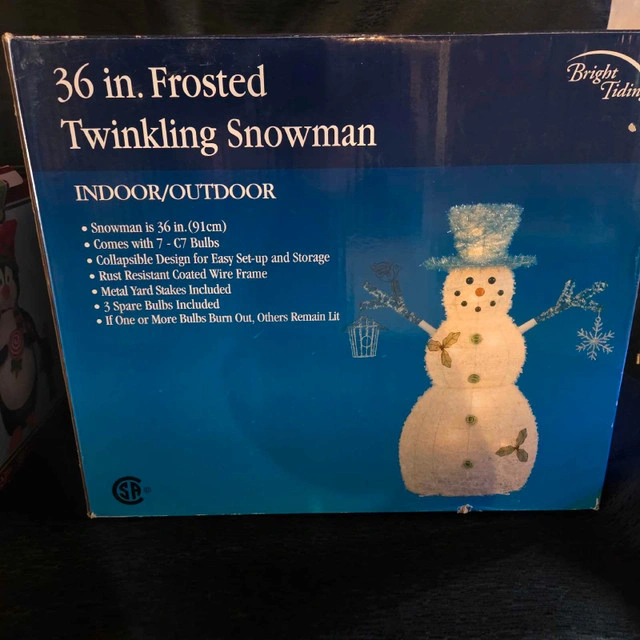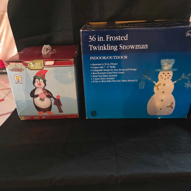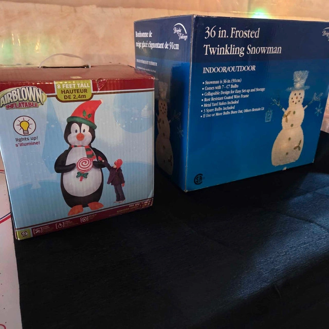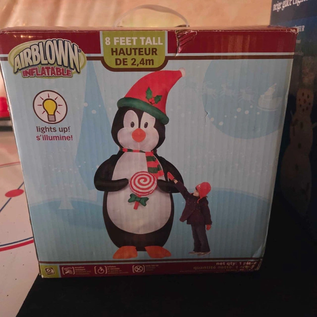 Get ready to spread some holiday cheer with this festive inflatable 8-foot penguin and Snowman! These charming characters are ready to light up your yard and bring smiles to all your neighbors. This inflatable decoration is barely used, but still in new condition and fully functional, ready to stand tall and bright throughout the next holiday season. All you need is an electrical outlet and you are set to go! Specifications: * Height: 8 feet * Characters: Penguin and Snowman * Condition: Used- New Condition * Includes: Inflatable, tethers, and stakes Since it's gently used, I'm pricing it to sell at $65 CAD for both , a great deal for such a joyful addition to your holiday decorations! If you're reading this, they're still available – ready to bring some whimsy to your winter wonderland!