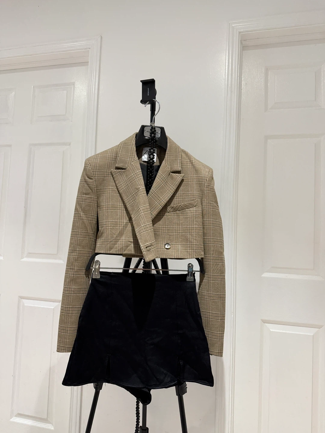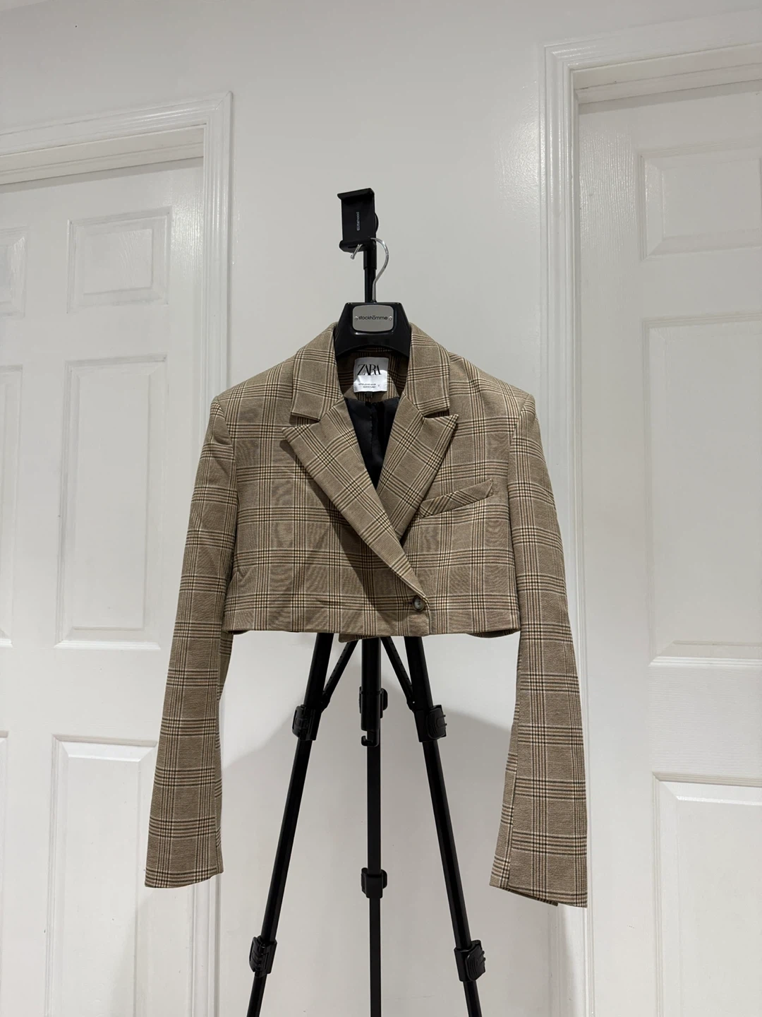 Selling a cute Zara cropped blazer. It's a plaid pattern in neutral tones. Size is XS. Perfect for layering or dressing up an outfit!
