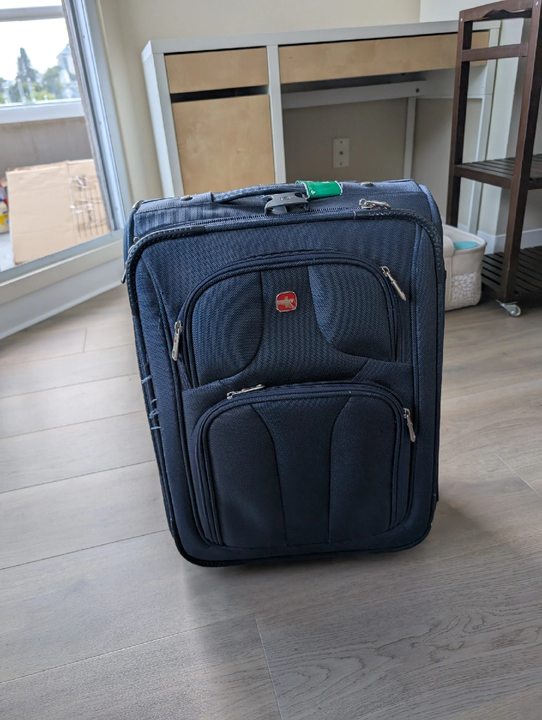 Looking to sell a SwissGear carry-on suitcase in navy blue! It's in great shape and ready for your next trip. Compact and easy to maneuver, it's perfect for short getaways or business trips. It has a few compartments to keep your belongings organized