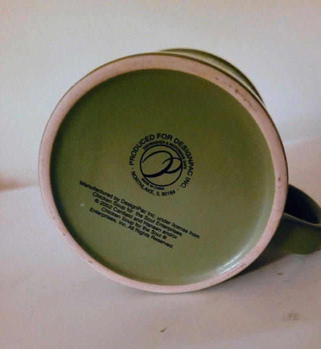 This is a Chicken Soup for the Soul coffee mug manufactured by Designpac Inc. The mug is in good condition and has been well taken care of. It's a charming piece, perfect for enjoying your favourite warm beverage while contemplating the deeper meanings of life, or just for a cozy night in. If the ad is up, it is available!