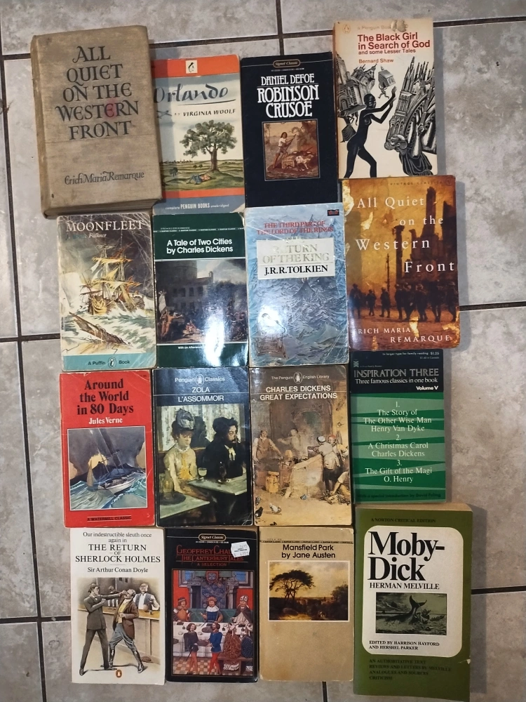 Selling a collection of classic literature books! Includes titles like: - All Quiet on the Western Front by Erich Maria Remarque - Orlando by Virginia Woolf - Robinson Crusoe by Daniel Defoe - The Black Girl in Search of God by Bernard Shaw - Moonfleet by J. Meade Falkner - A Tale of Two Cities by Charles Dickens - The Return of the King by J.R.R. Tolkien - Around the World in 80 Days by Jules Verne - L'Assommoir by Zola - Great Expectations by Charles Dickens - Inspiration Three - The Return of Sherlock Holmes by Sir Arthur Conan Doyle - The Canterbury Tales by Geoffrey Chaucer - Mansfield Park by Jane Austen - Moby Dick by Herman Melville 25 cents each.